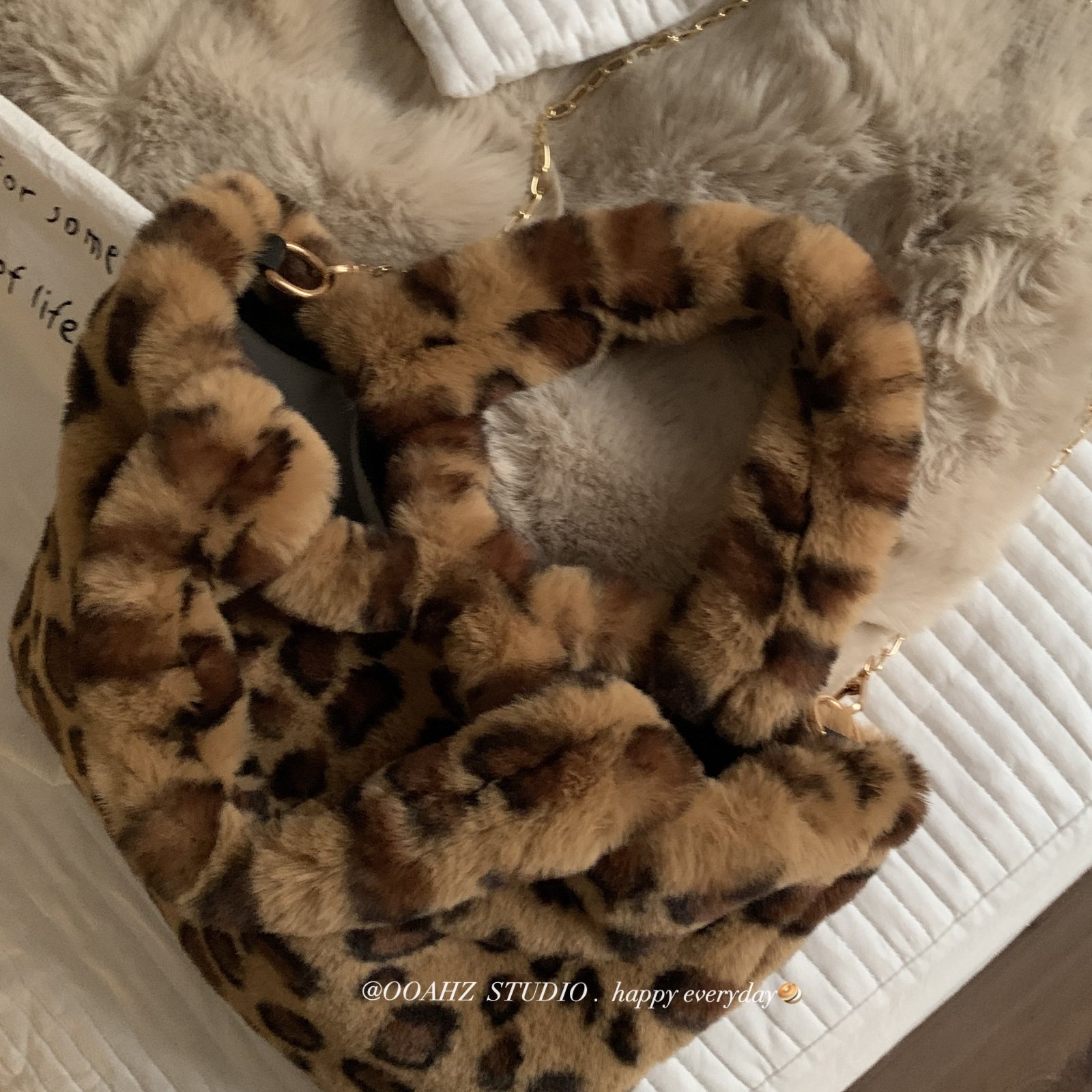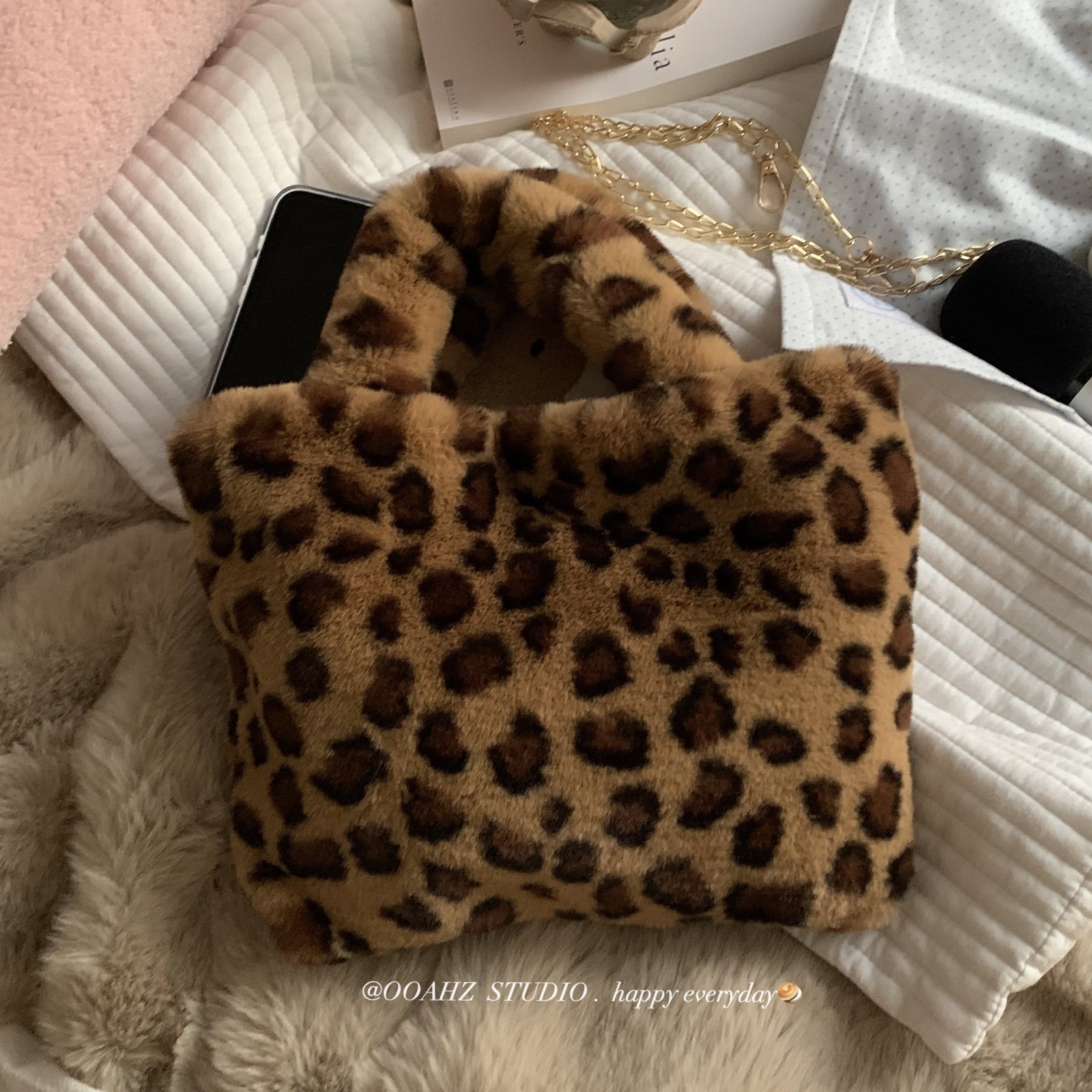 拿走不谢~毛绒绒仿獭兔毛豹纹手提包 链条斜跨包大容量包包手拎袋
