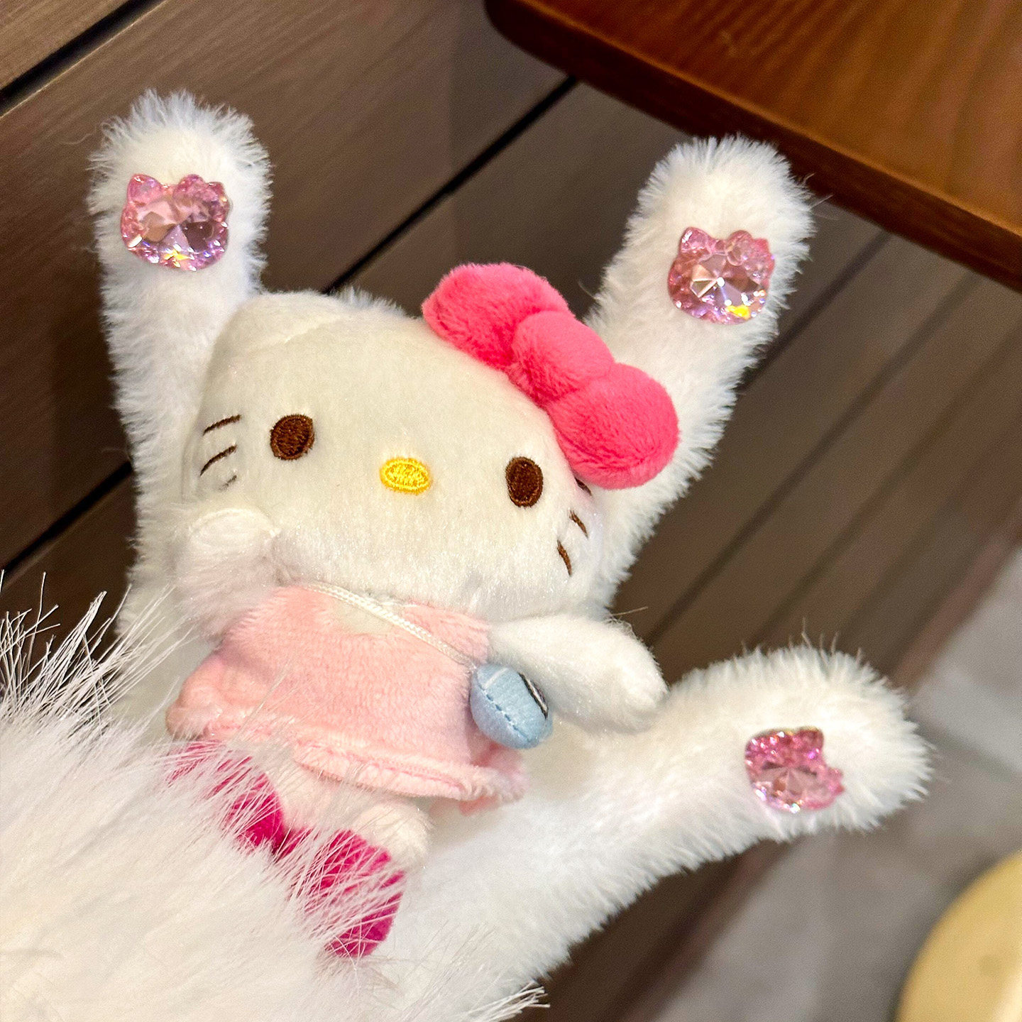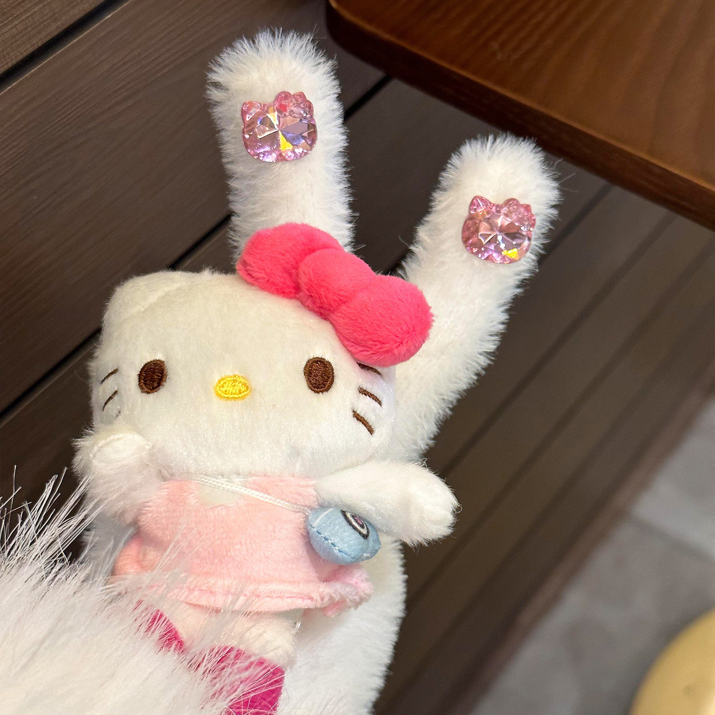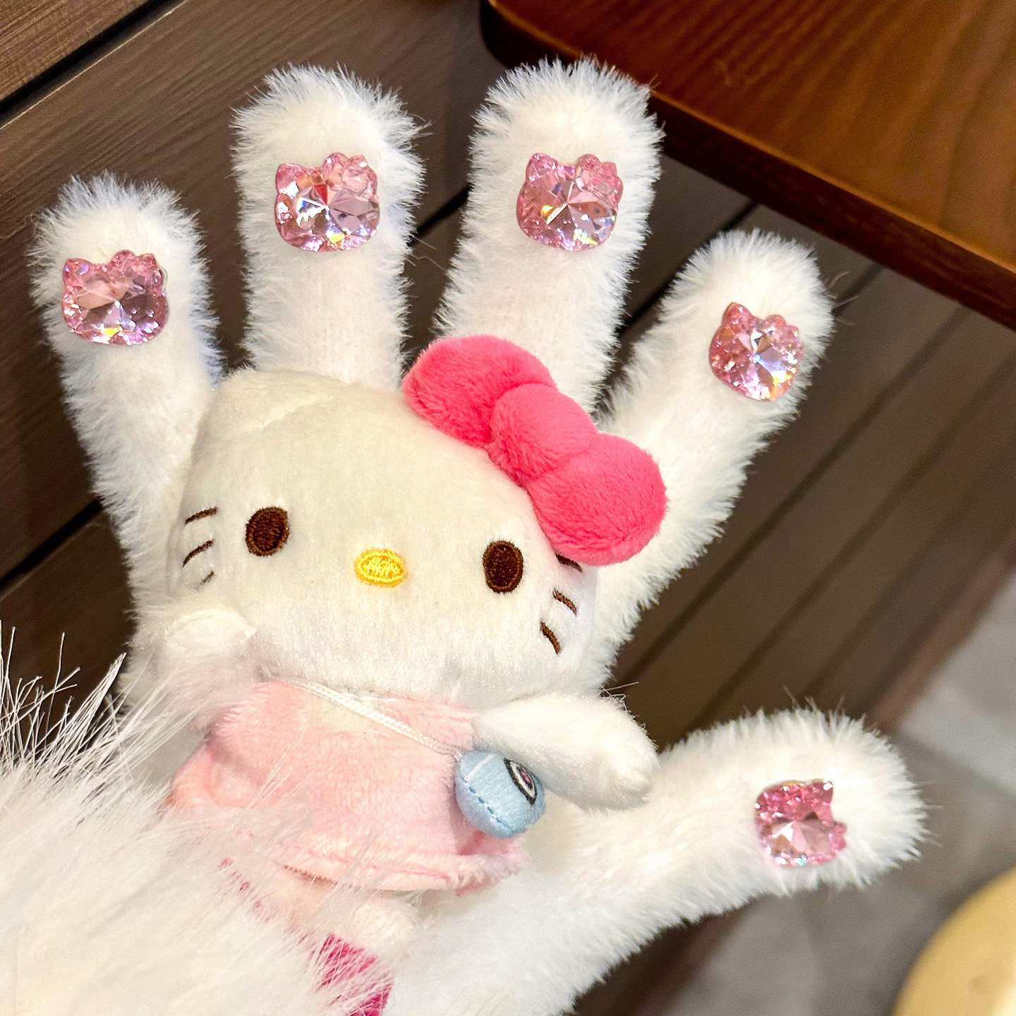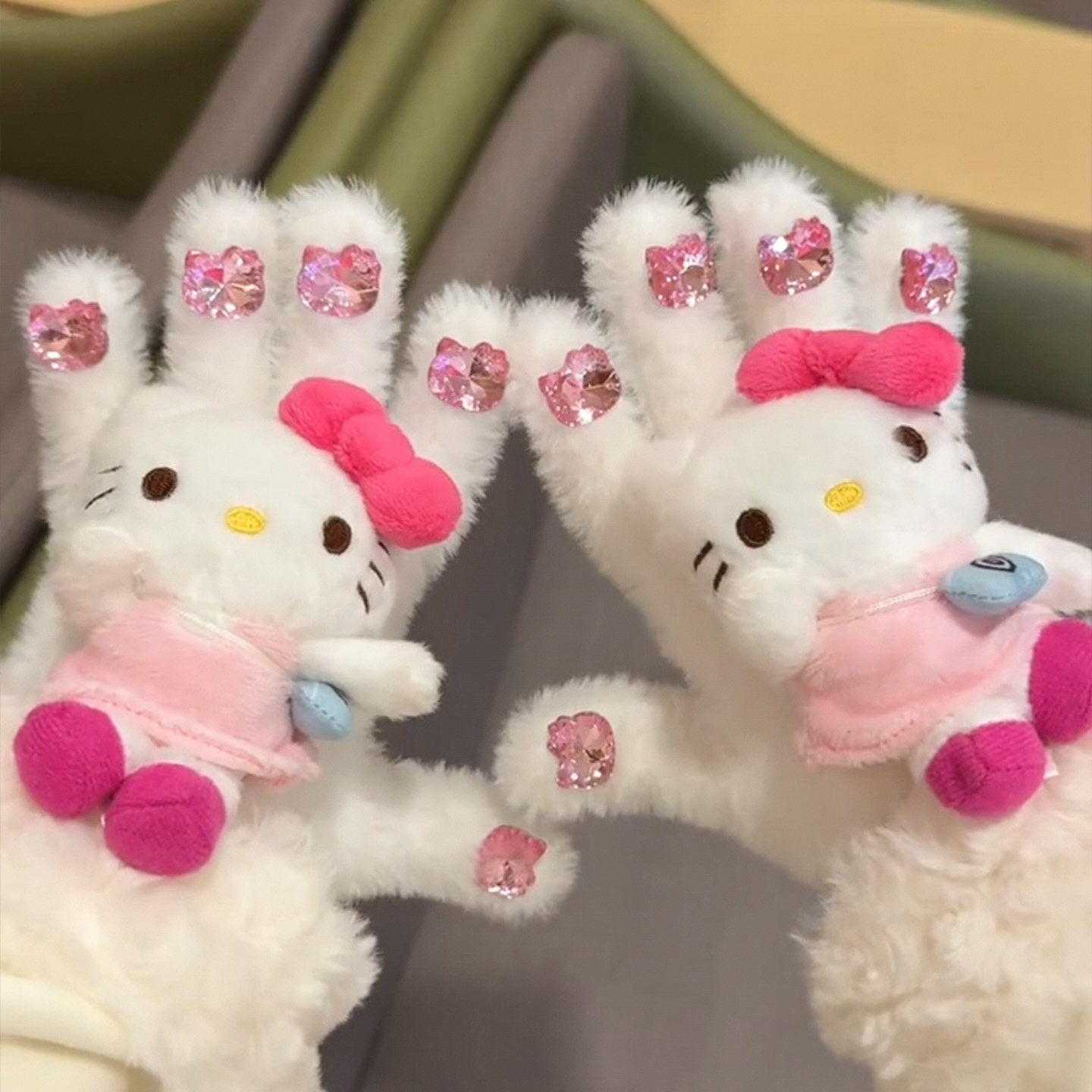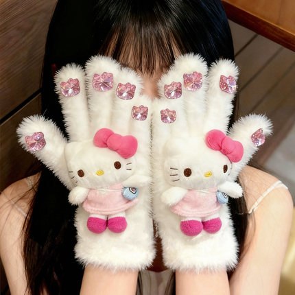 可爱软糯粉色水钻kitty五指毛绒手套女冬季毛茸茸骑车保暖防寒潮