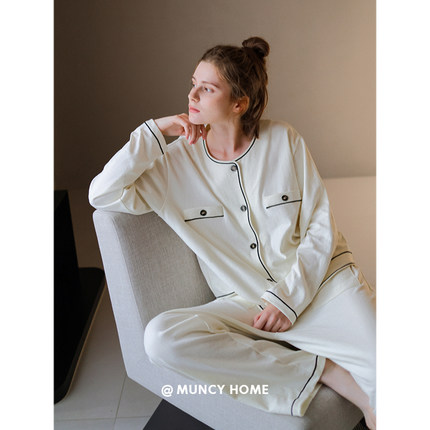 曼系纯棉睡衣女春秋宽松简约圆领开衫纯色家居服时尚外穿长袖套装