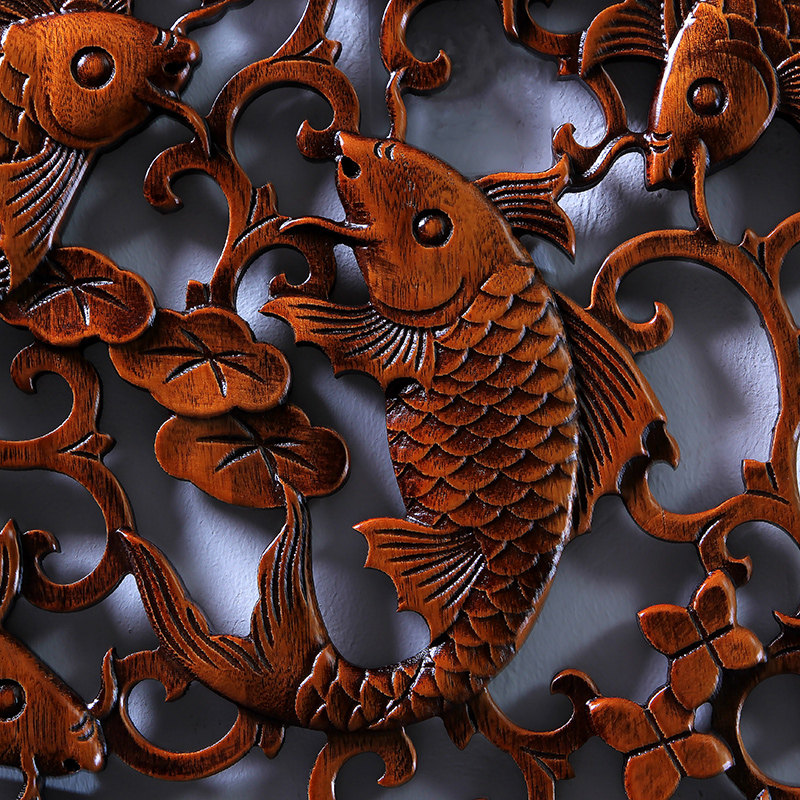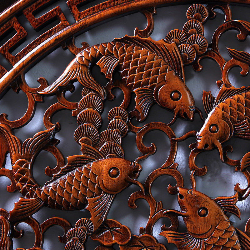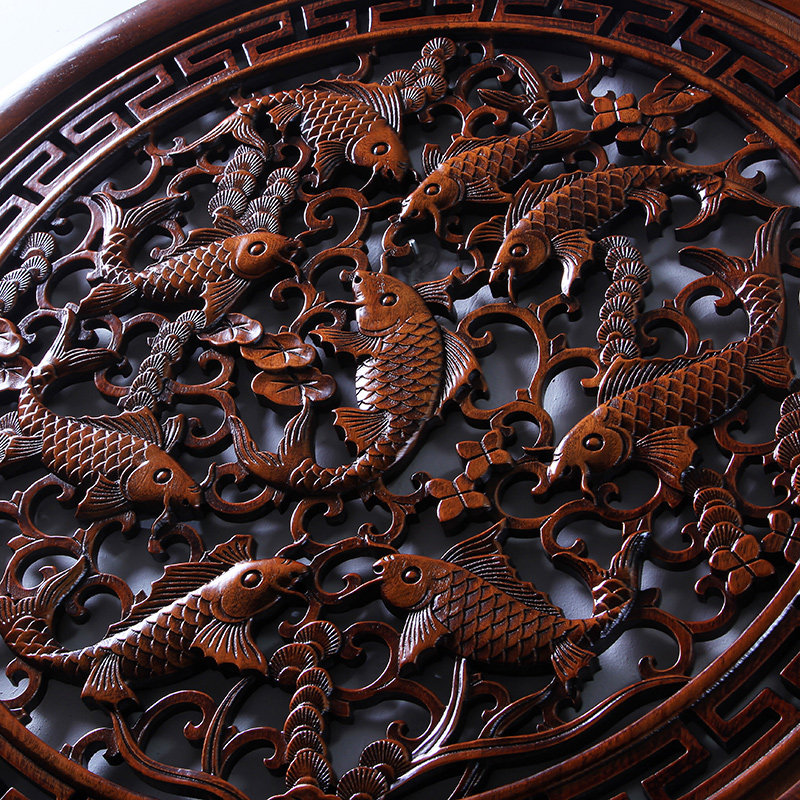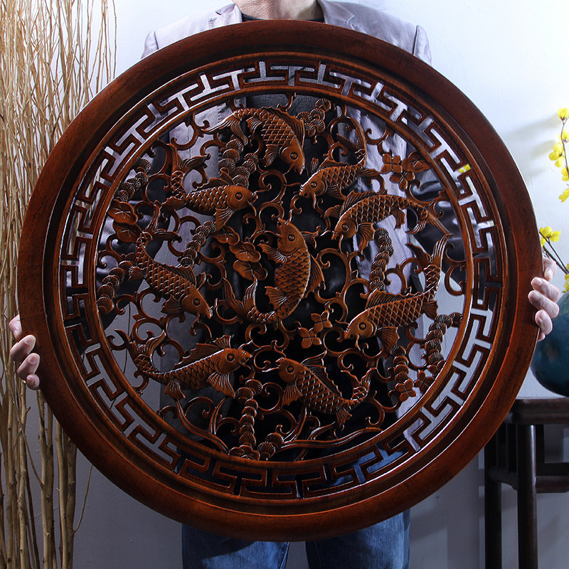 东阳木雕挂件香樟木头雕刻画工艺装饰品中式客厅实木质艺术九鱼图