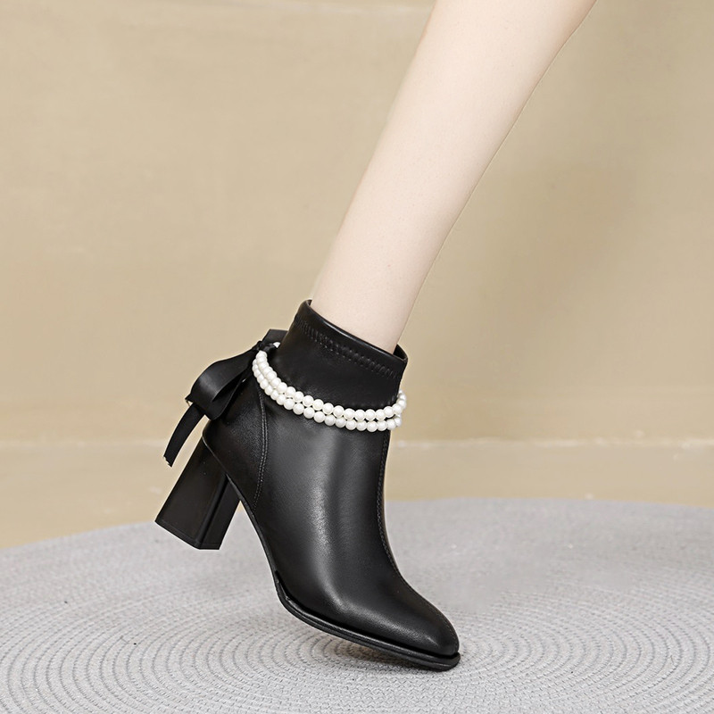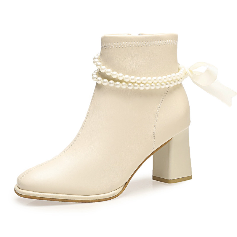 马丁靴女靴子2025新款秋冬网红瘦瘦靴方头粗跟短靴裸靴米色高跟鞋