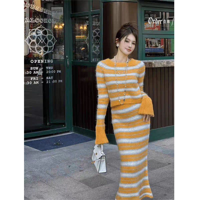 设计感撞色条纹套头毛衣高腰显瘦半身裙两件套女新款时尚套装