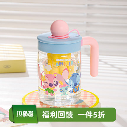 川岛屋史迪仔玻璃杯子女高颜值吸管水杯带盖果汁杯茶水分离泡茶杯