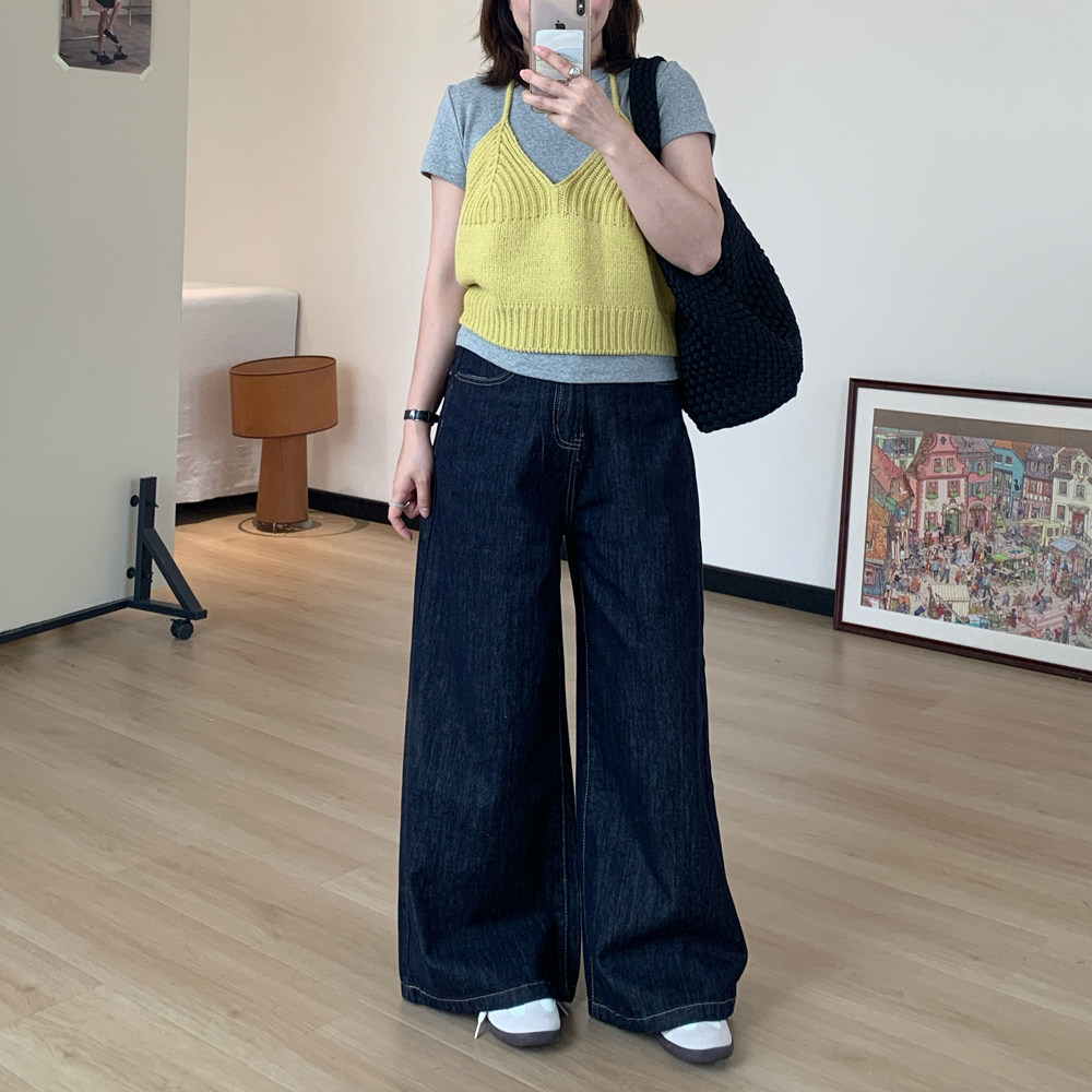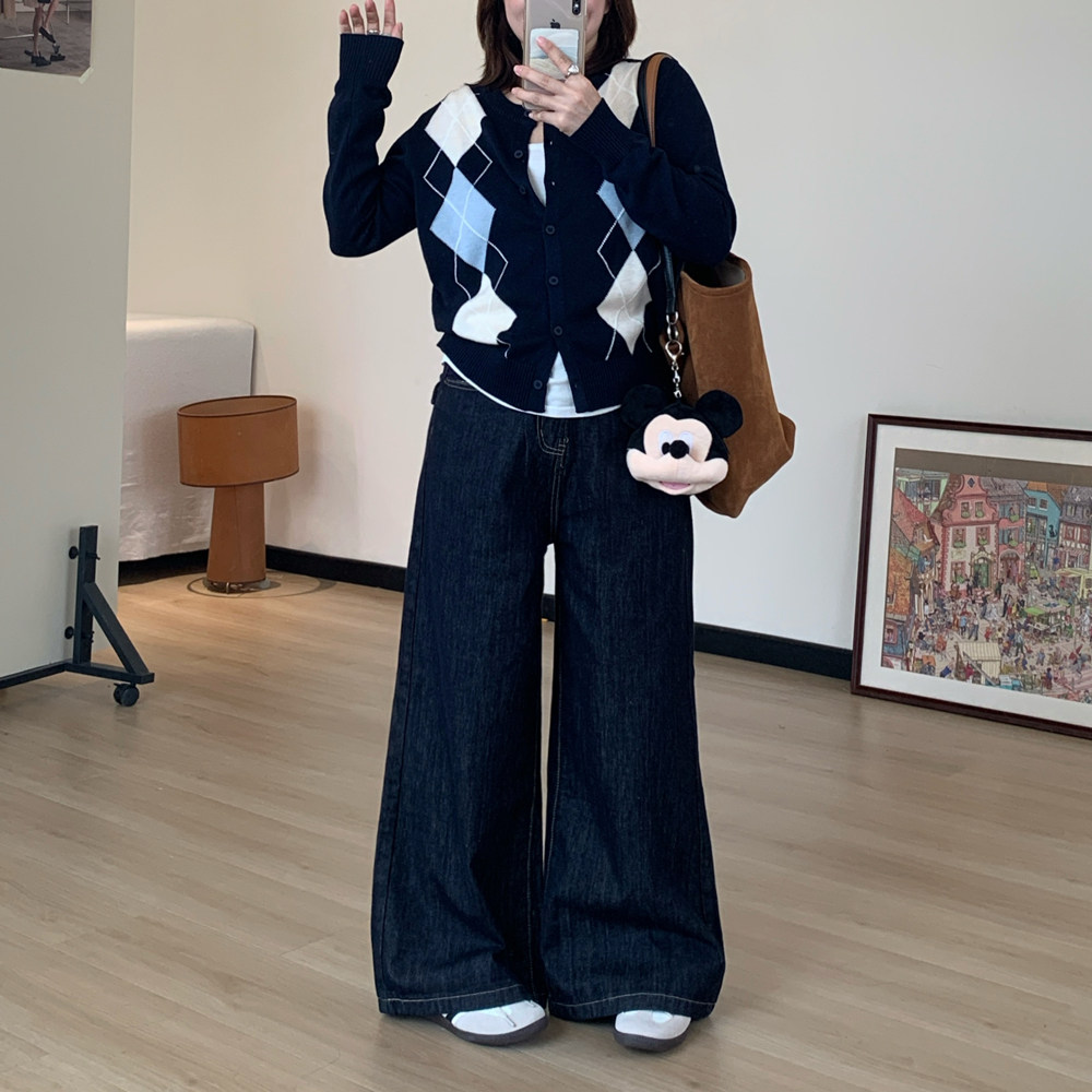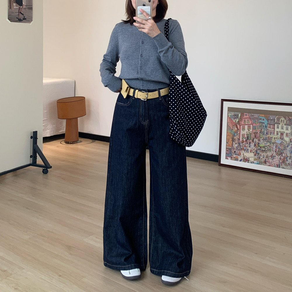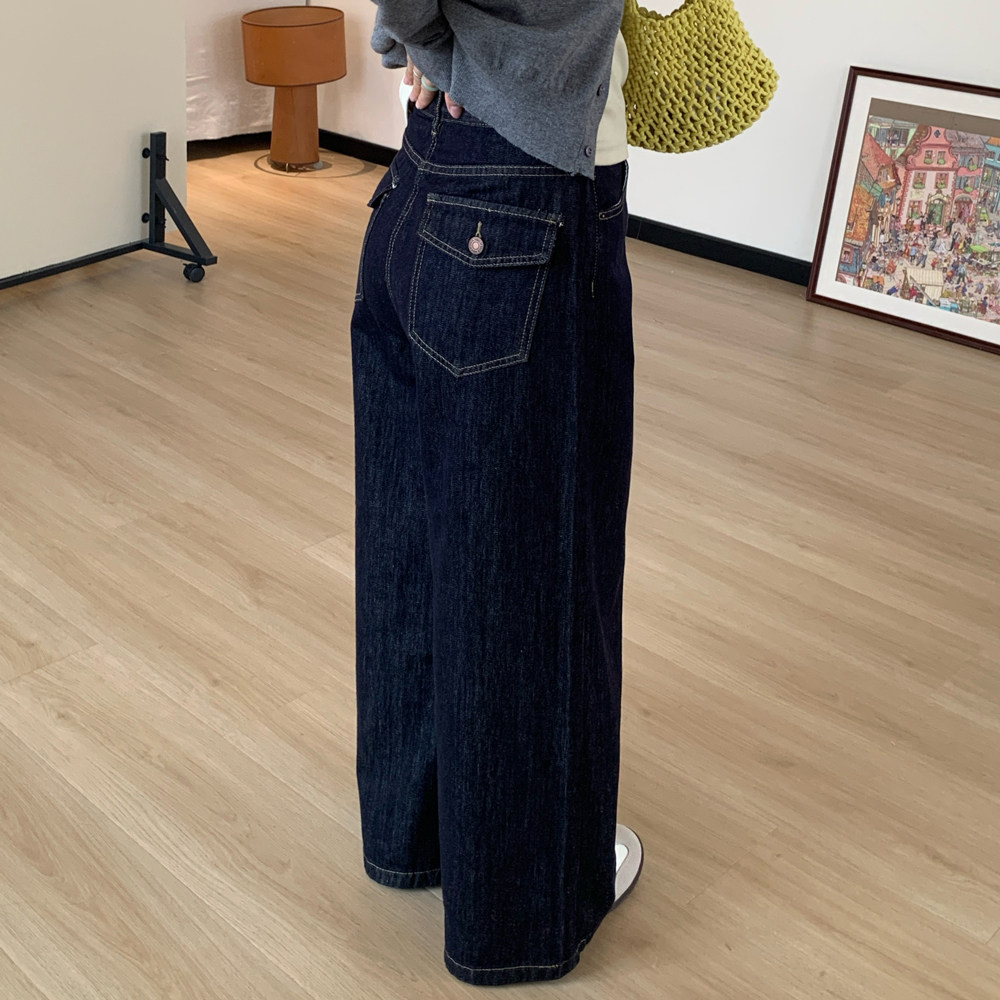 Omang桃喜 深蓝原色阔腿牛仔裤女春秋高腰百搭慵懒宽松直筒拖地裤