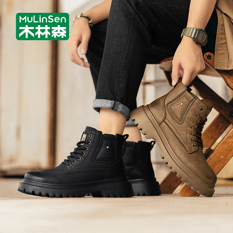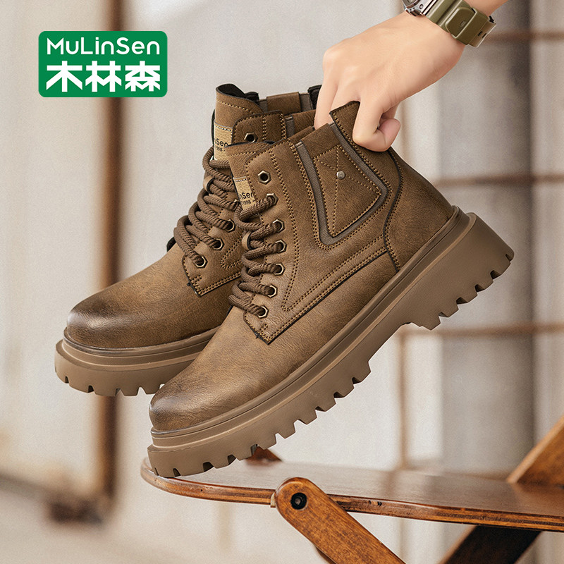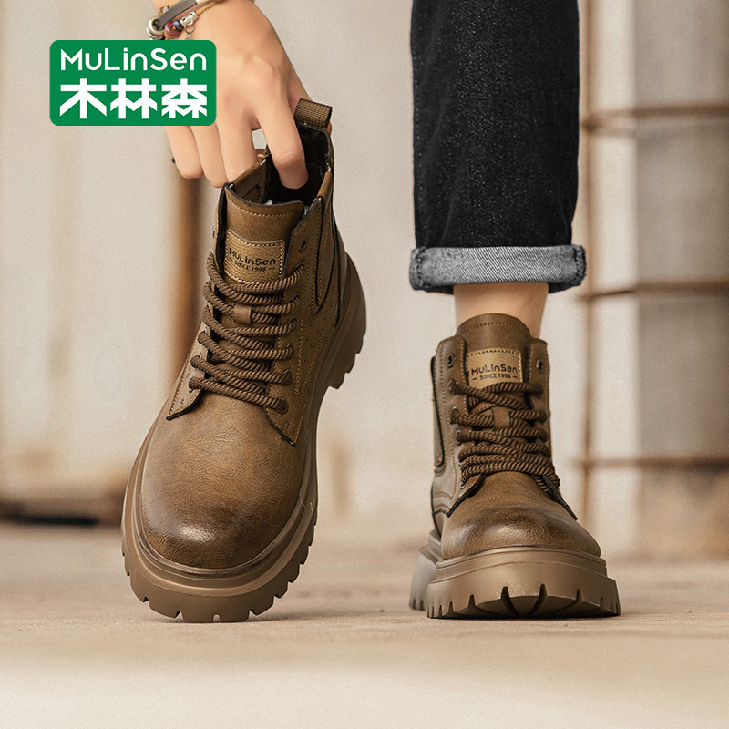 木林森户外工装靴男款高帮皮靴真皮沙漠靴冬季棕色复古增高马丁靴