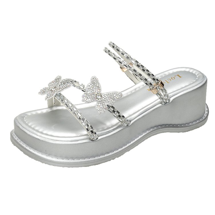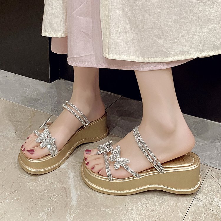 夏季凉拖鞋女高跟厚底2025新款仙女风水钻蝴蝶结坡跟外穿一字拖鞋