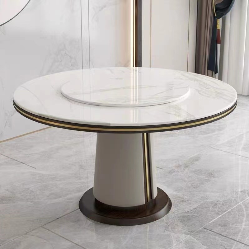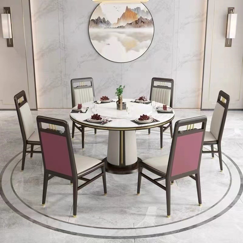 新中式岩板圆餐桌椅组合现代简约乌金木圆形转盘酒店餐厅家用家具