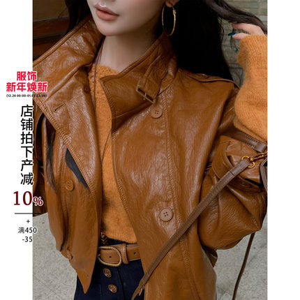 利达 NEW DADADA【漫游时光】卡其色皮衣休闲修身短款PU皮外套女