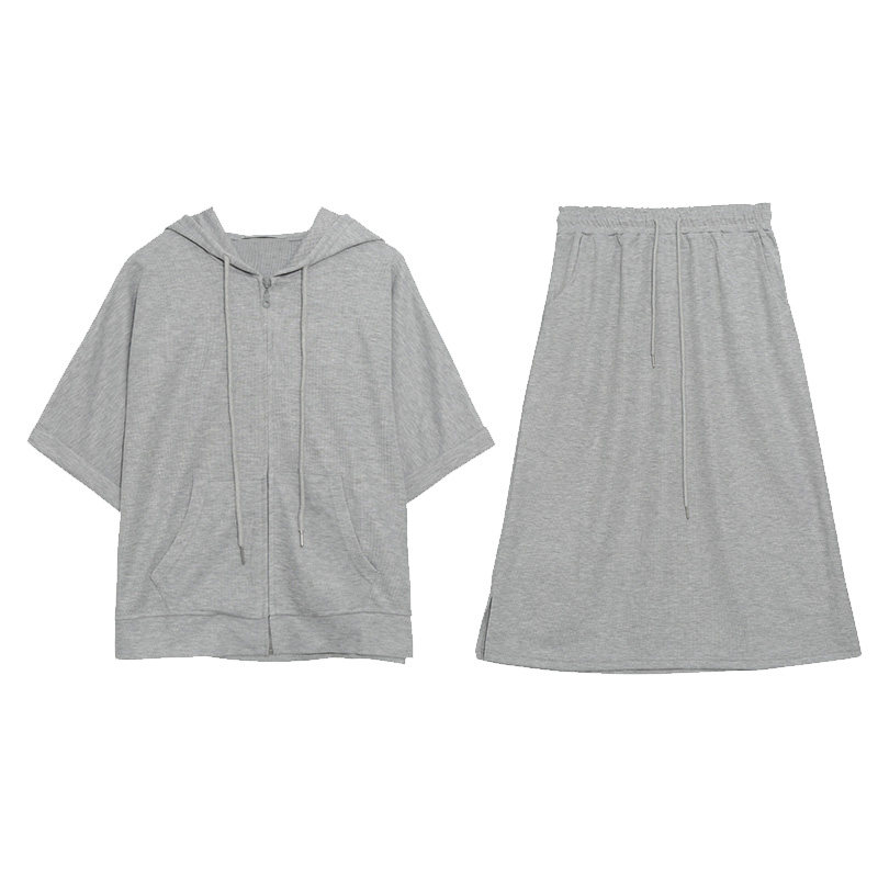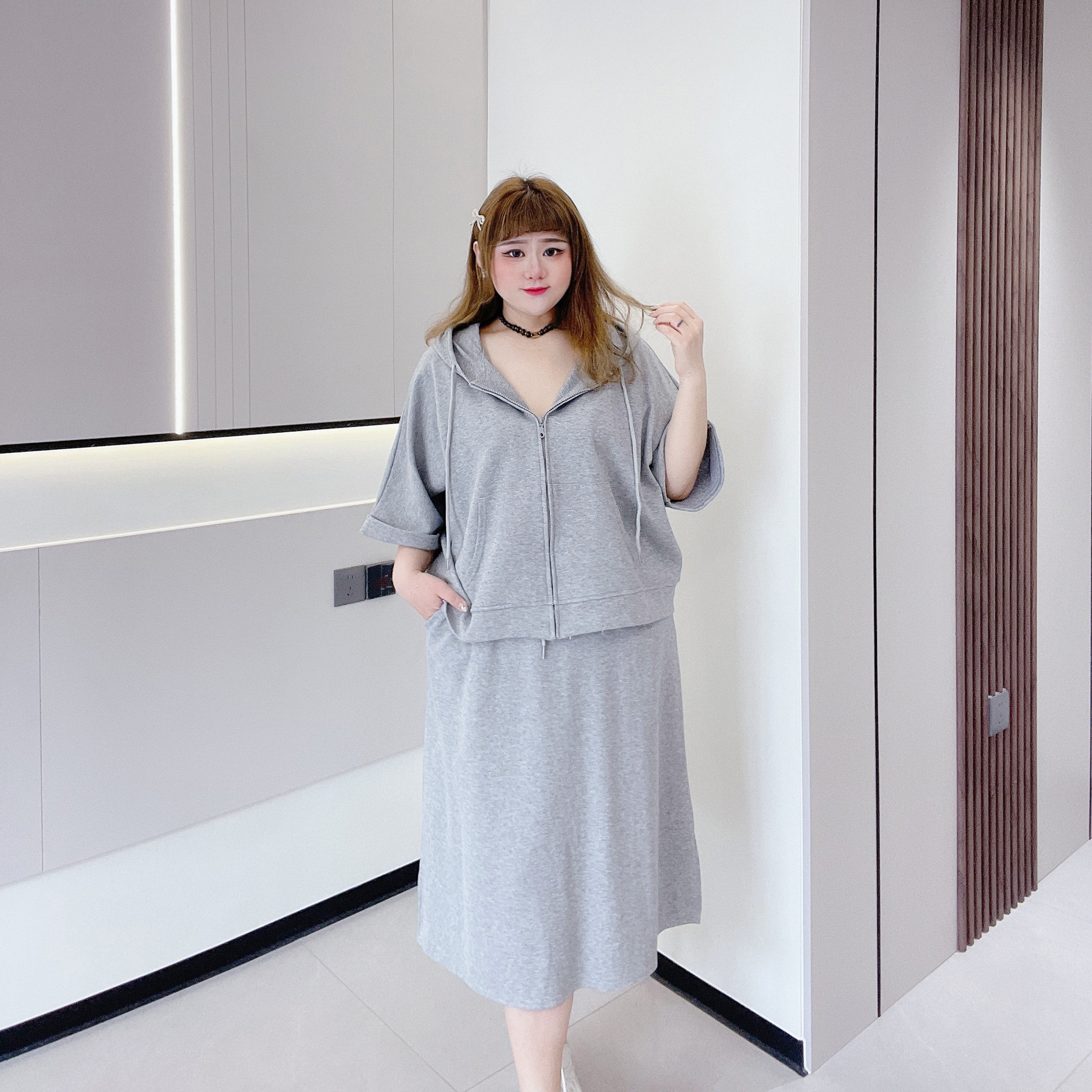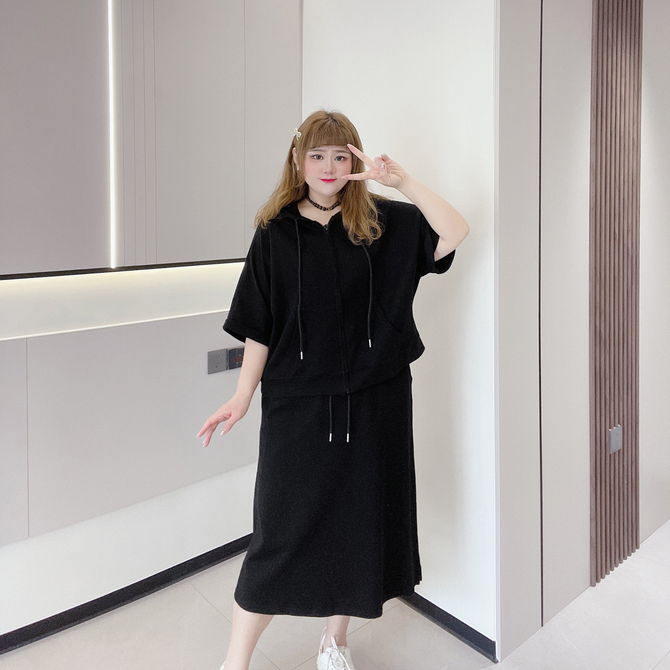 240斤大码女装夏款胖mm宽松休闲连帽卫衣减龄运动风ins半身裙套装