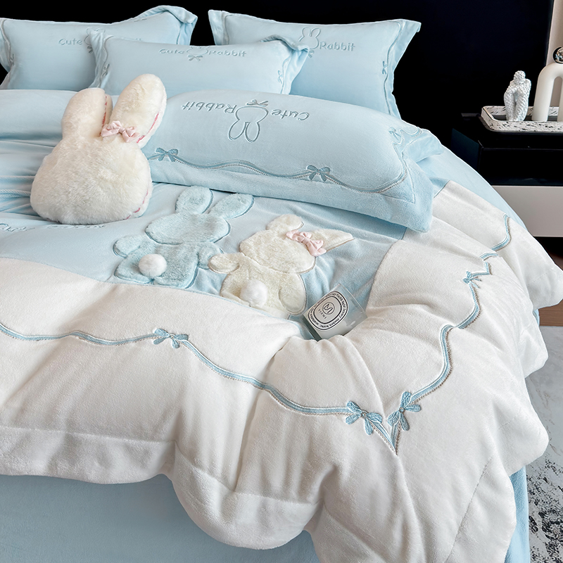 秋冬季加厚A类婴儿牛奶绒四件套兔子刺绣被套双面保暖珊瑚绒床品4