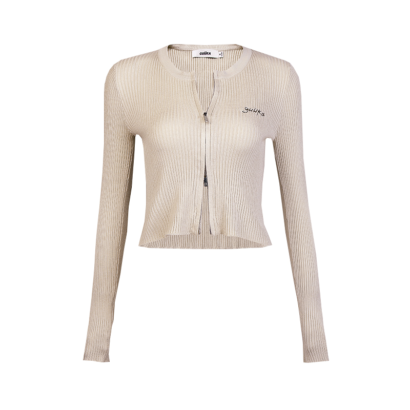 GUUKAHERO杏色短款开衫毛衣女秋 美式复古针织衫双头拉链外套修身