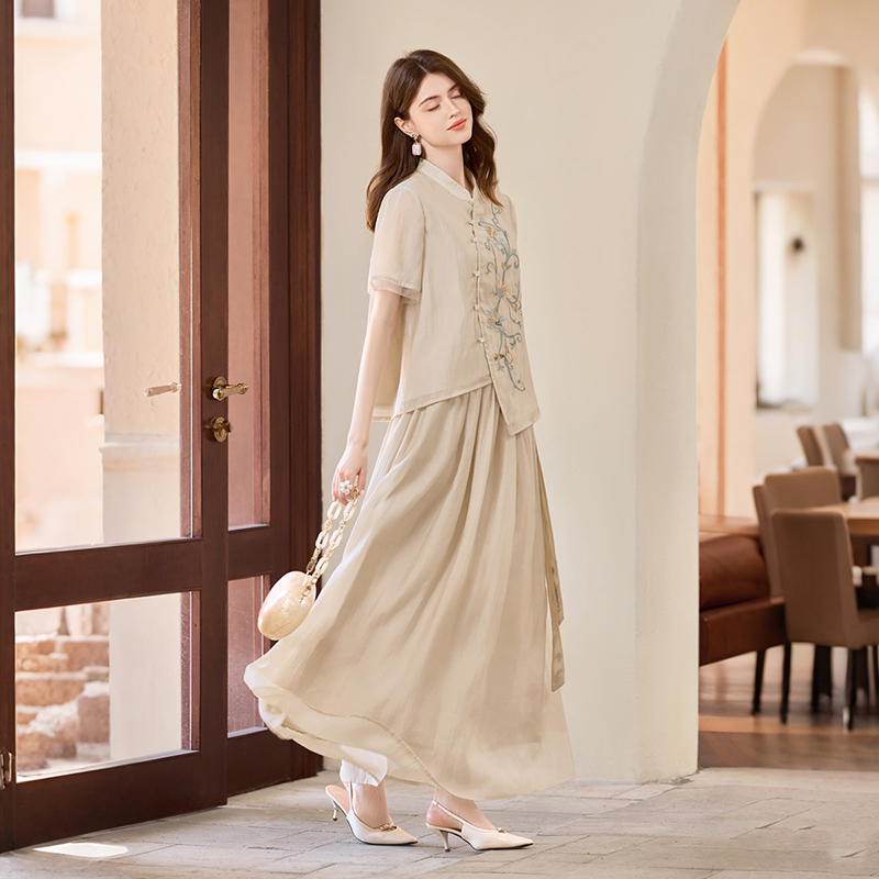 她池时尚套装2025夏装新款女装立领上衣搭A字半身裙新中式两件套