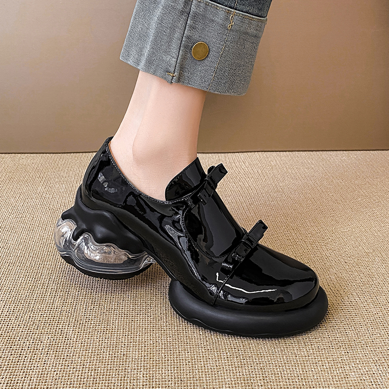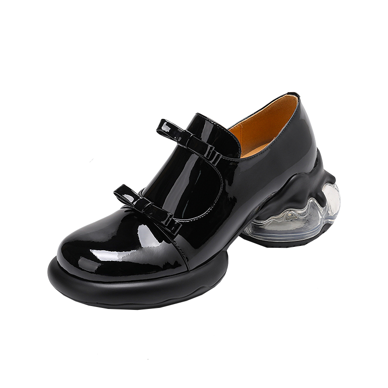英伦风蝴蝶结小皮鞋女2025新款厚底高跟一脚蹬乐福鞋真皮黑色单鞋