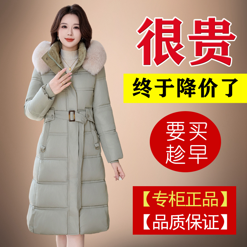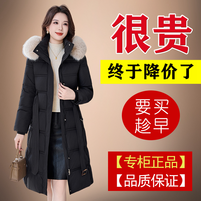 鸭鸭羽绒服女士中长款过膝2025冬季新款保暖白鸭绒收腰显瘦大毛领