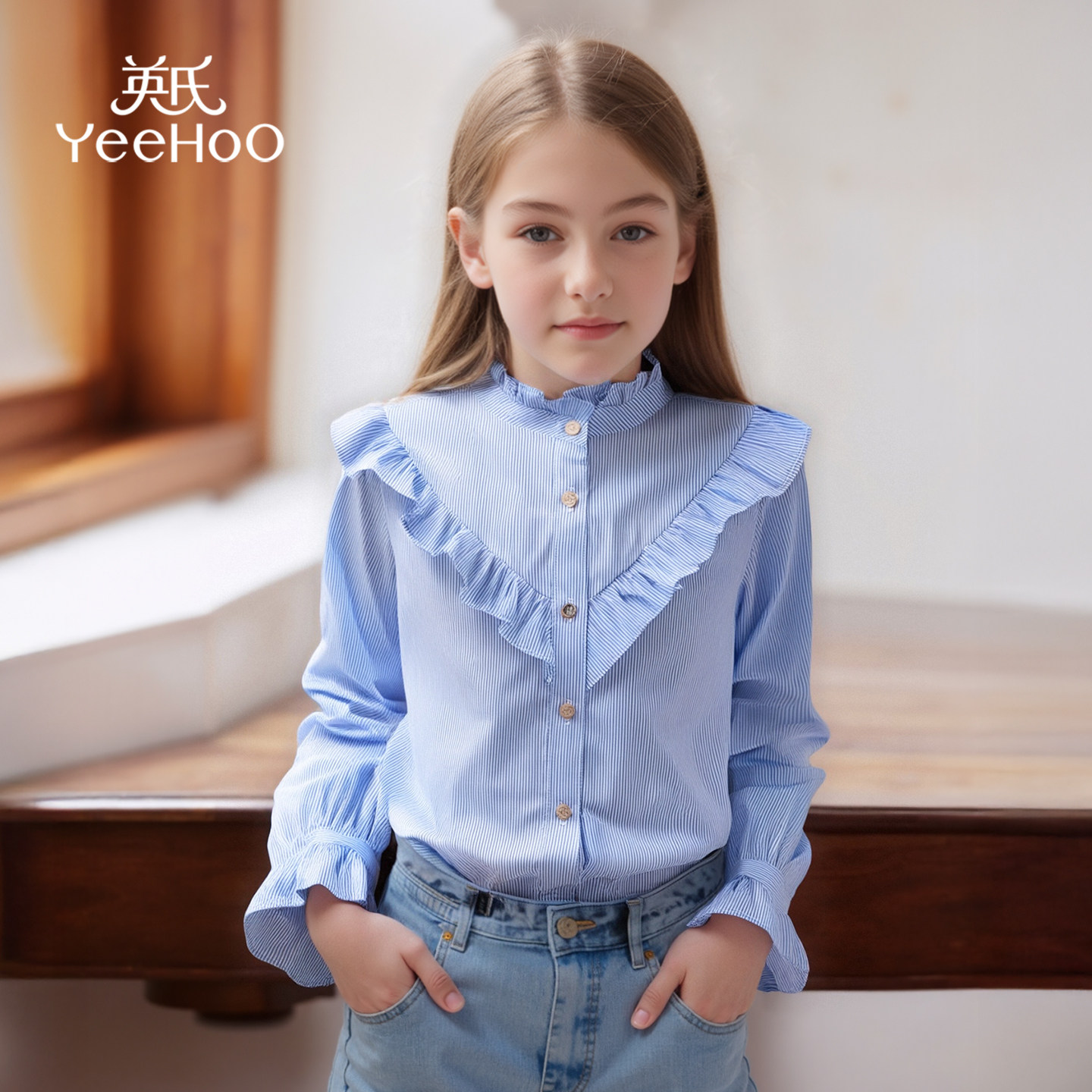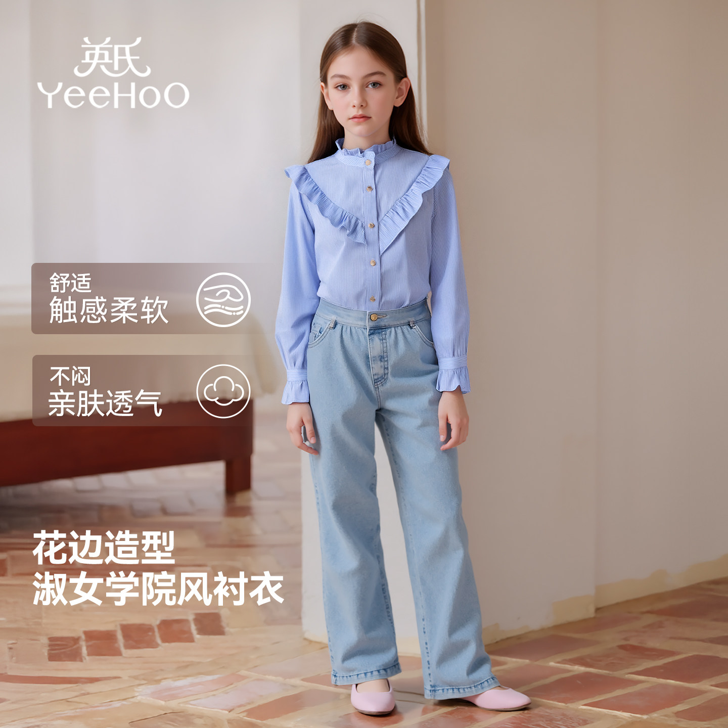 英氏女童长袖衬衣2025年秋季新款纯棉喇叭袖中大童花边立领衬衫
