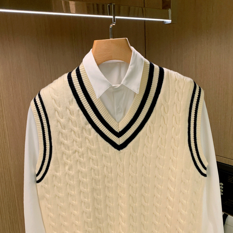 背心针织鸡心领拼色坎肩毛衣复古