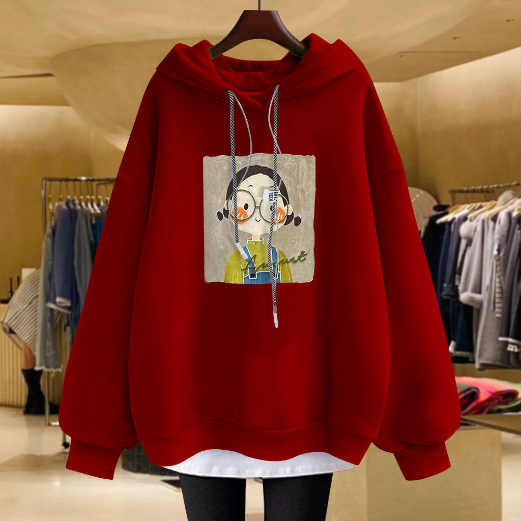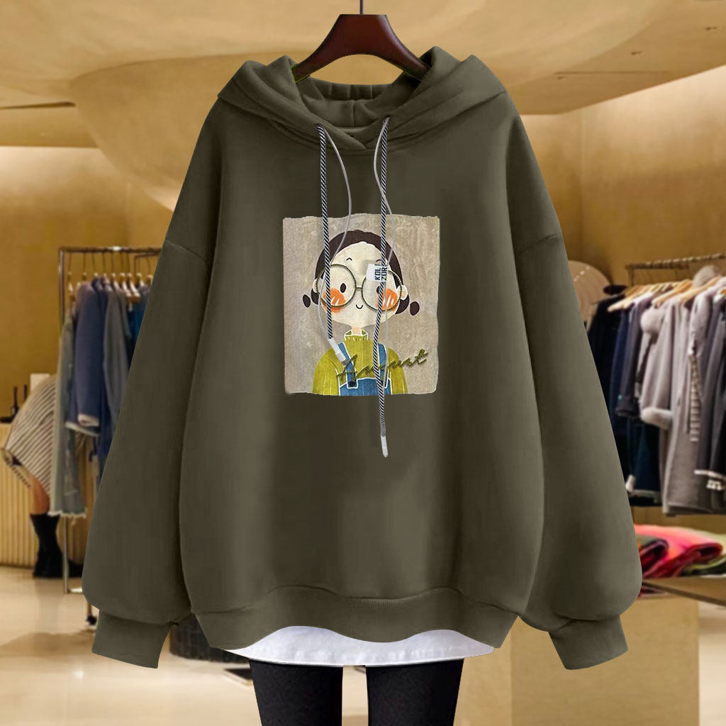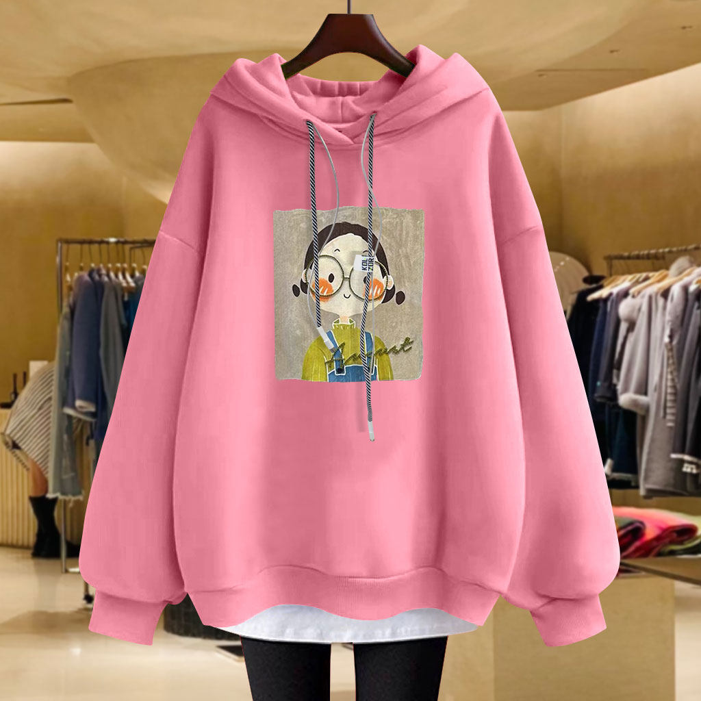 2025春秋冬季可爱眼镜女孩中长款加绒加厚宽松套头圆领卫衣女潮