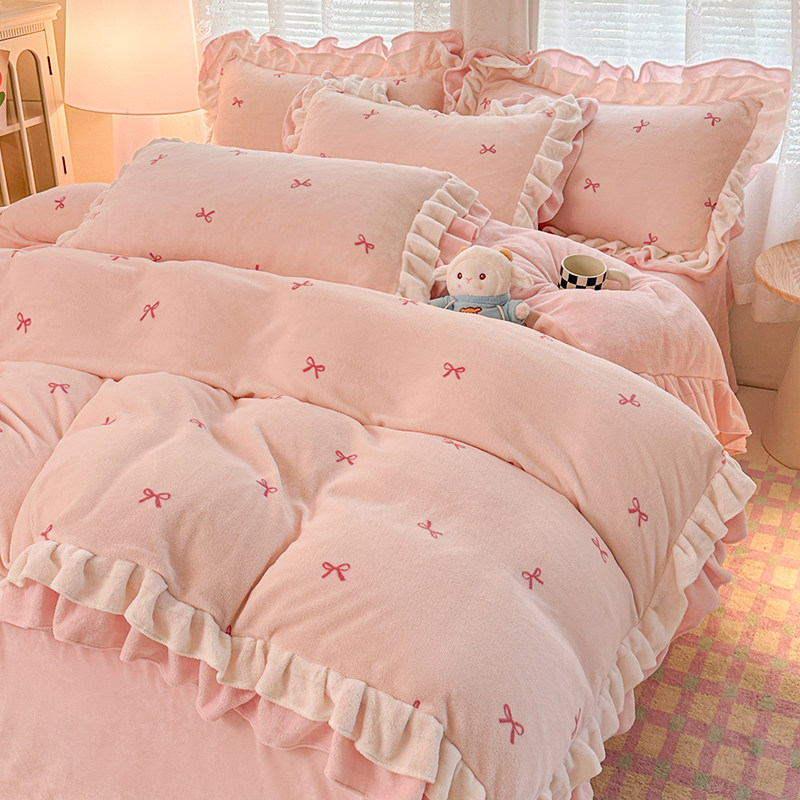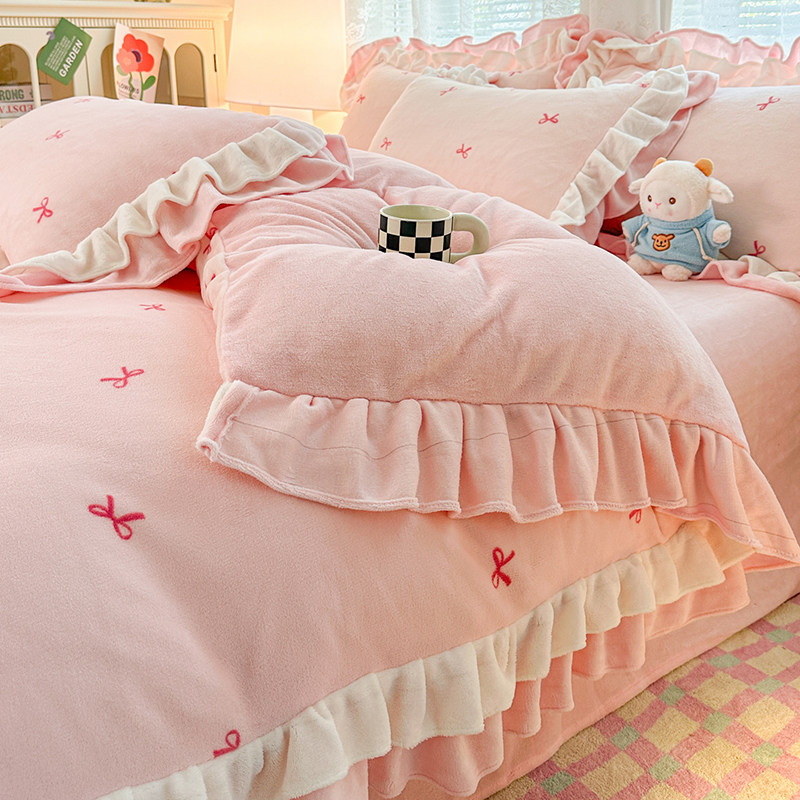 小清新公主风牛奶绒四件套冬季加厚保暖珊瑚绒法莱珊瑚绒被套床单