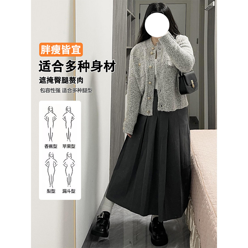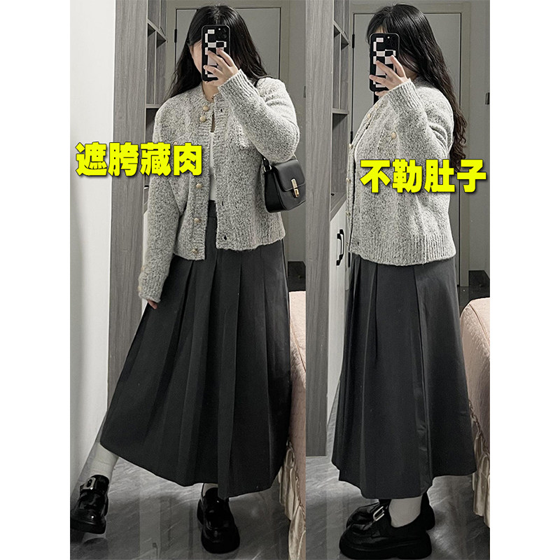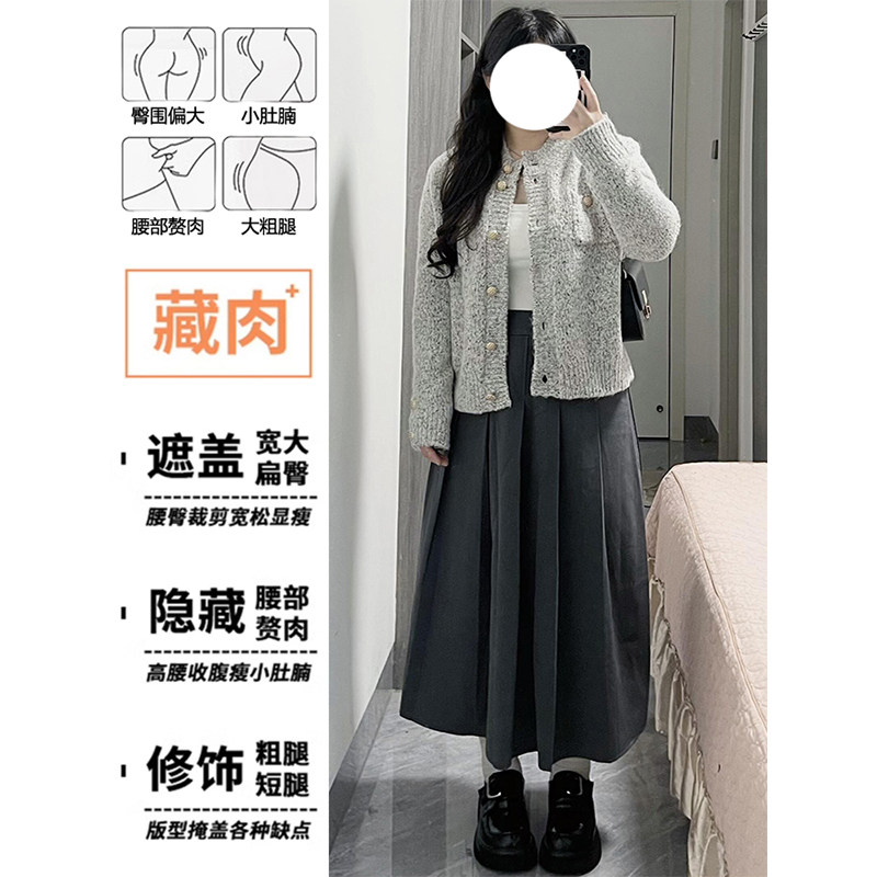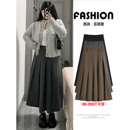 灰色西装半身裙女夏季大码胖mm垂坠感高腰遮肚显瘦a字百褶中长裙