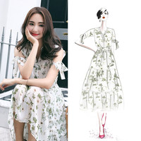 尤麦雪纺碎花V领连衣裙2020中长款女夏小清新超仙小个子收腰裙子