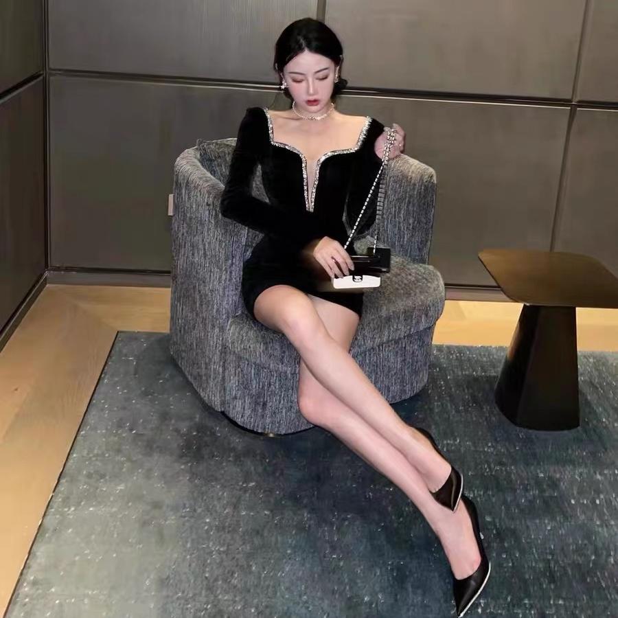 秋冬高级名媛小香风低胸性感方领长袖丝绒连衣裙高端气质包臀短裙