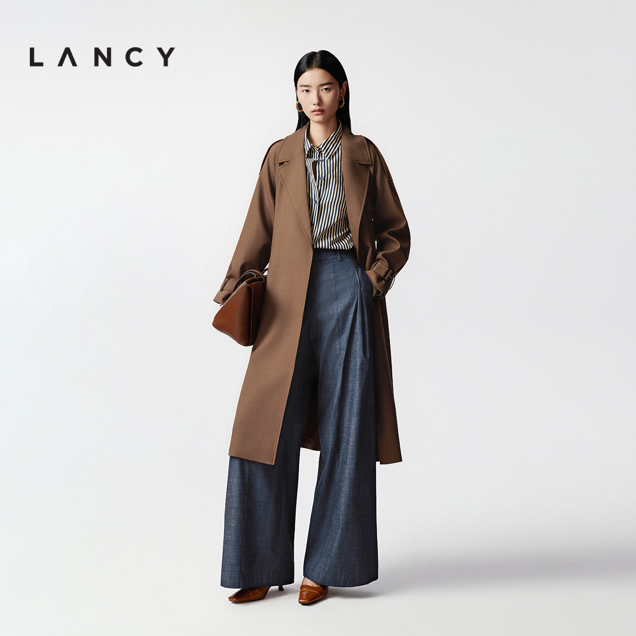 LANCY/朗姿2025秋新款气质通勤羊毛翻领风衣美拉德长款大衣外套女