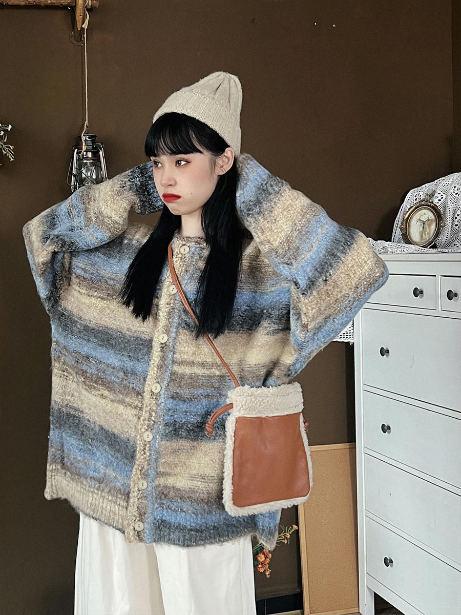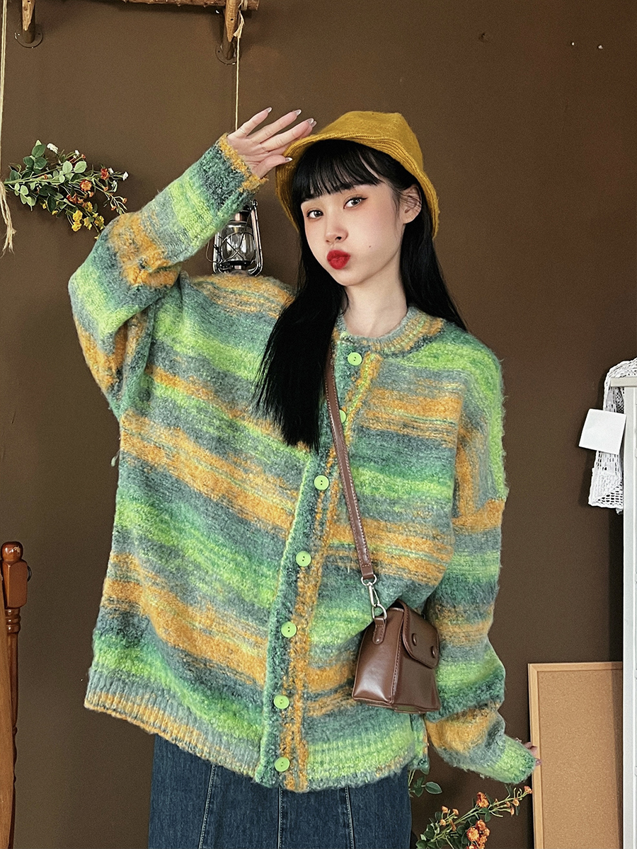 【十万八万】复古彩色晕染渐变毛衣女加厚冬季宽松慵懒风针织开衫