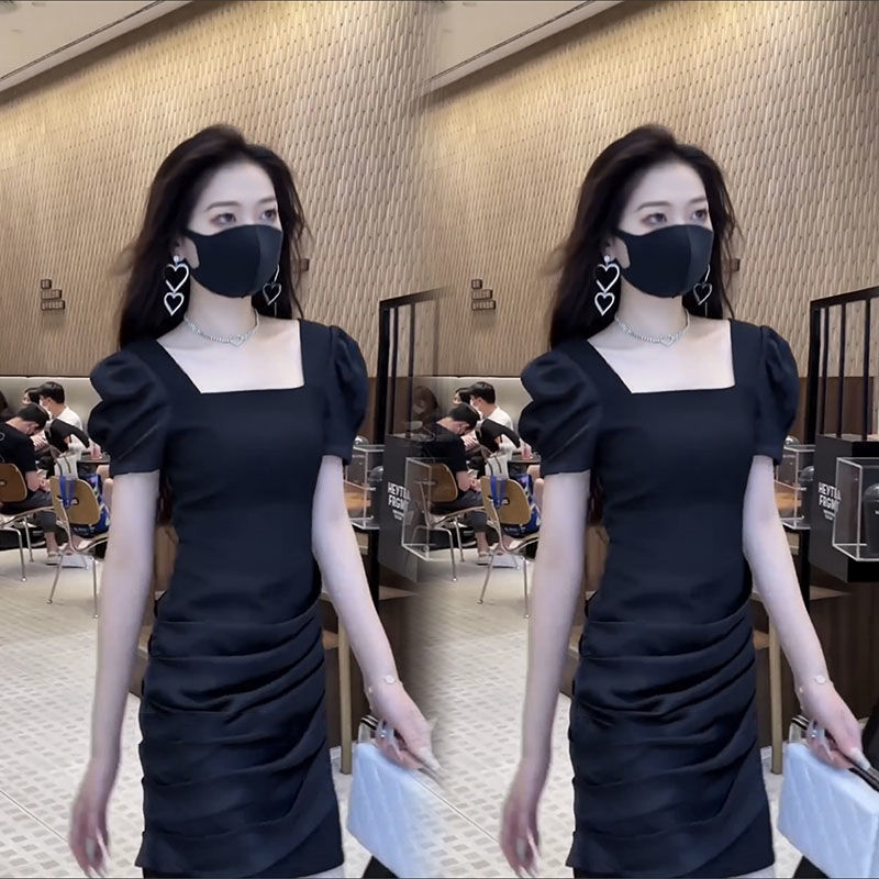 法式泡泡袖方领连衣裙女夏2023新款赫本风气质修身显瘦短款包臀裙