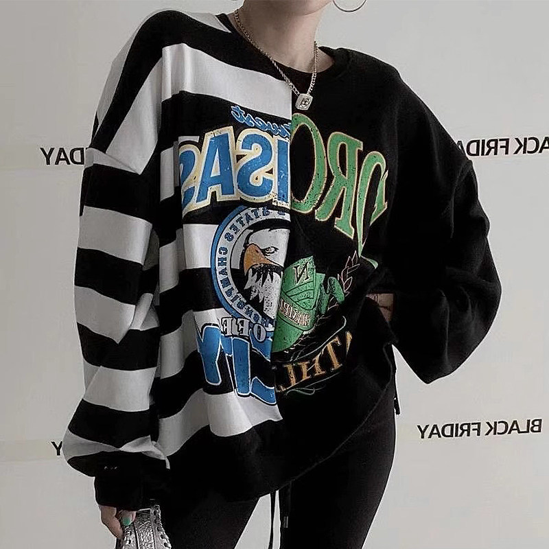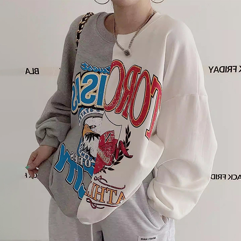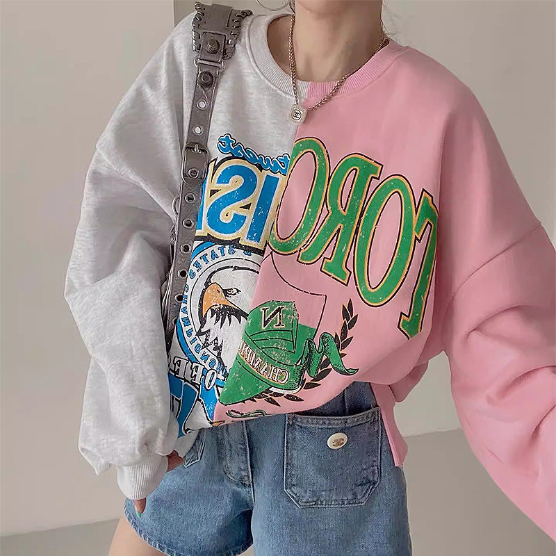 韩国chic秋季复古洋气圆领撞色拼接宽松百搭长袖字母卡通印花卫衣