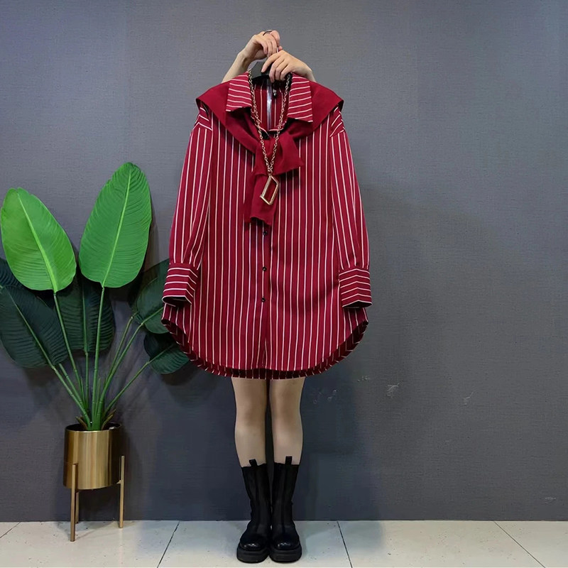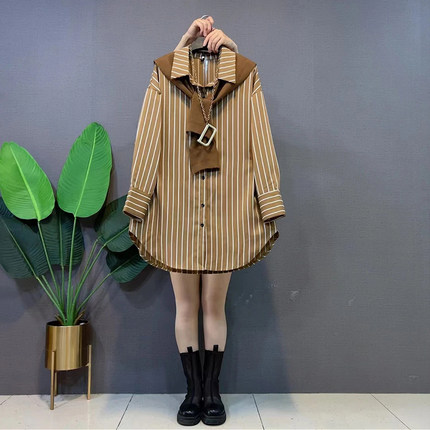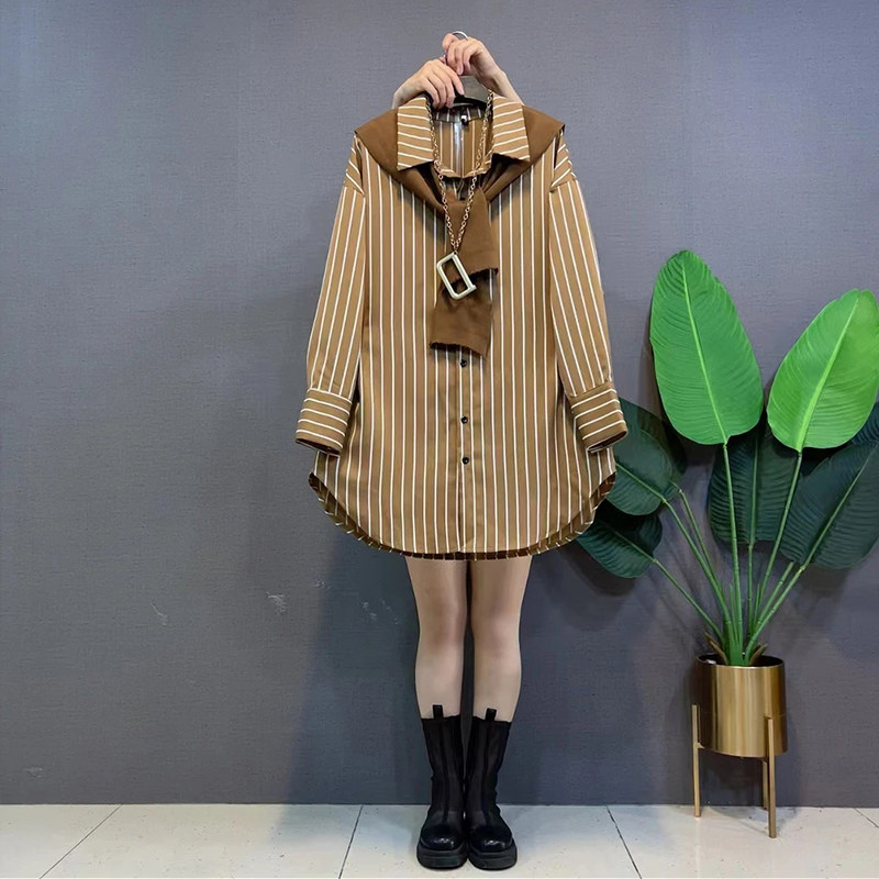 加肥大码女装纯色披肩翻领长袖条纹衬衫胖妹妹秋季款休闲两件套潮