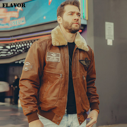 秋冬新款真皮皮衣男美式大码袖标毛领加棉男士A2飞行员皮夹克短款