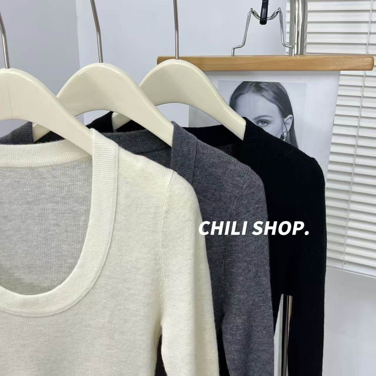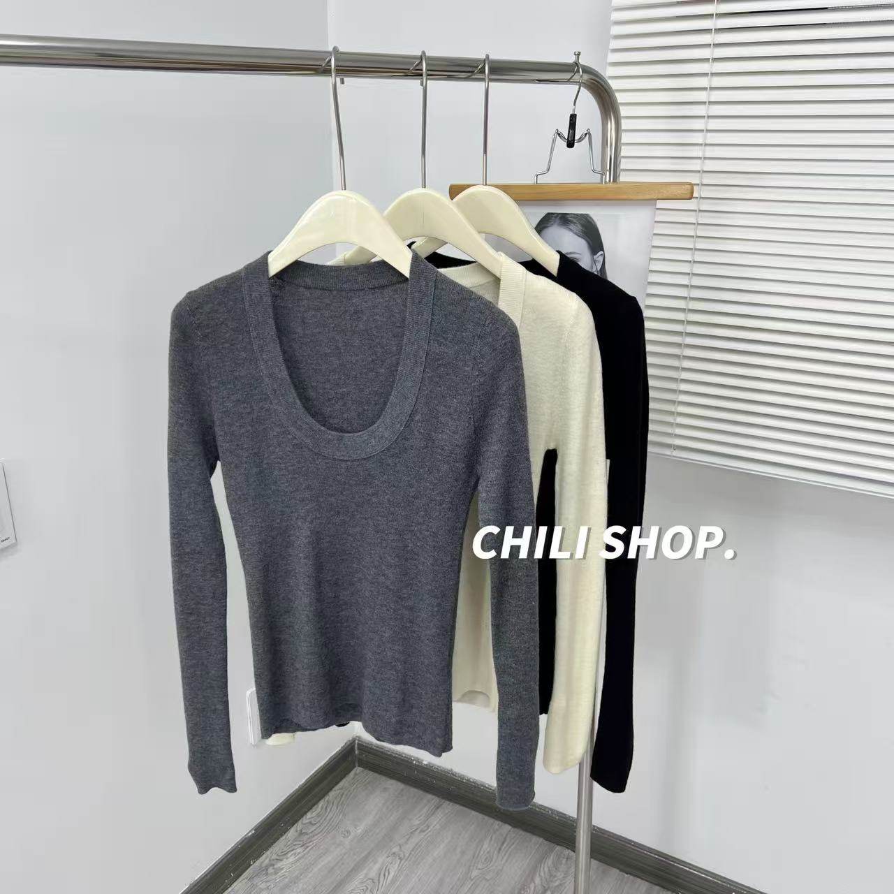 【英英Chili】大U领气质100全羊毛修身显瘦针织打底毛衣T 10.20