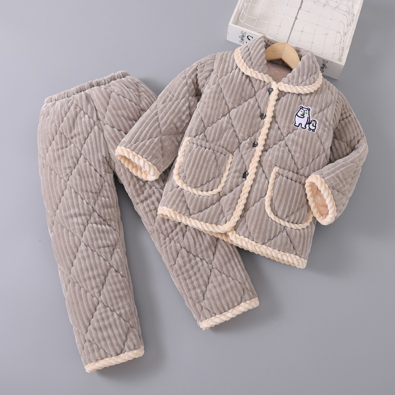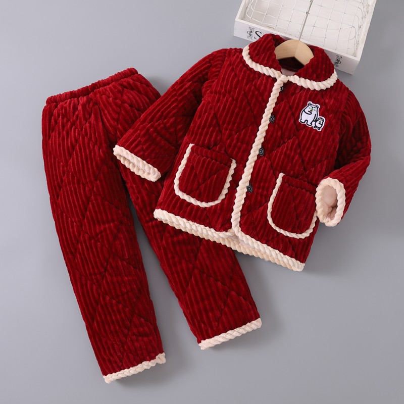 儿童法兰绒睡衣秋冬季加绒加厚珊瑚绒三层夹棉男童家居服保暖套装