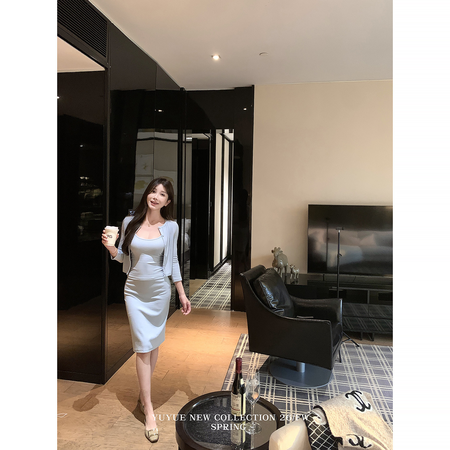 七分袖短款开衫吊带包臀半裙套装