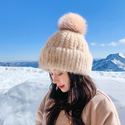 女士冬季皮草帽子水貂毛编织弹力甜美女帽银狐貉子毛球针织贝雷帽