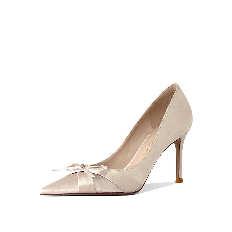 杏色绸缎面高跟鞋女细跟蝴蝶结婚鞋气质宴会礼服鞋黑色尖头单鞋女