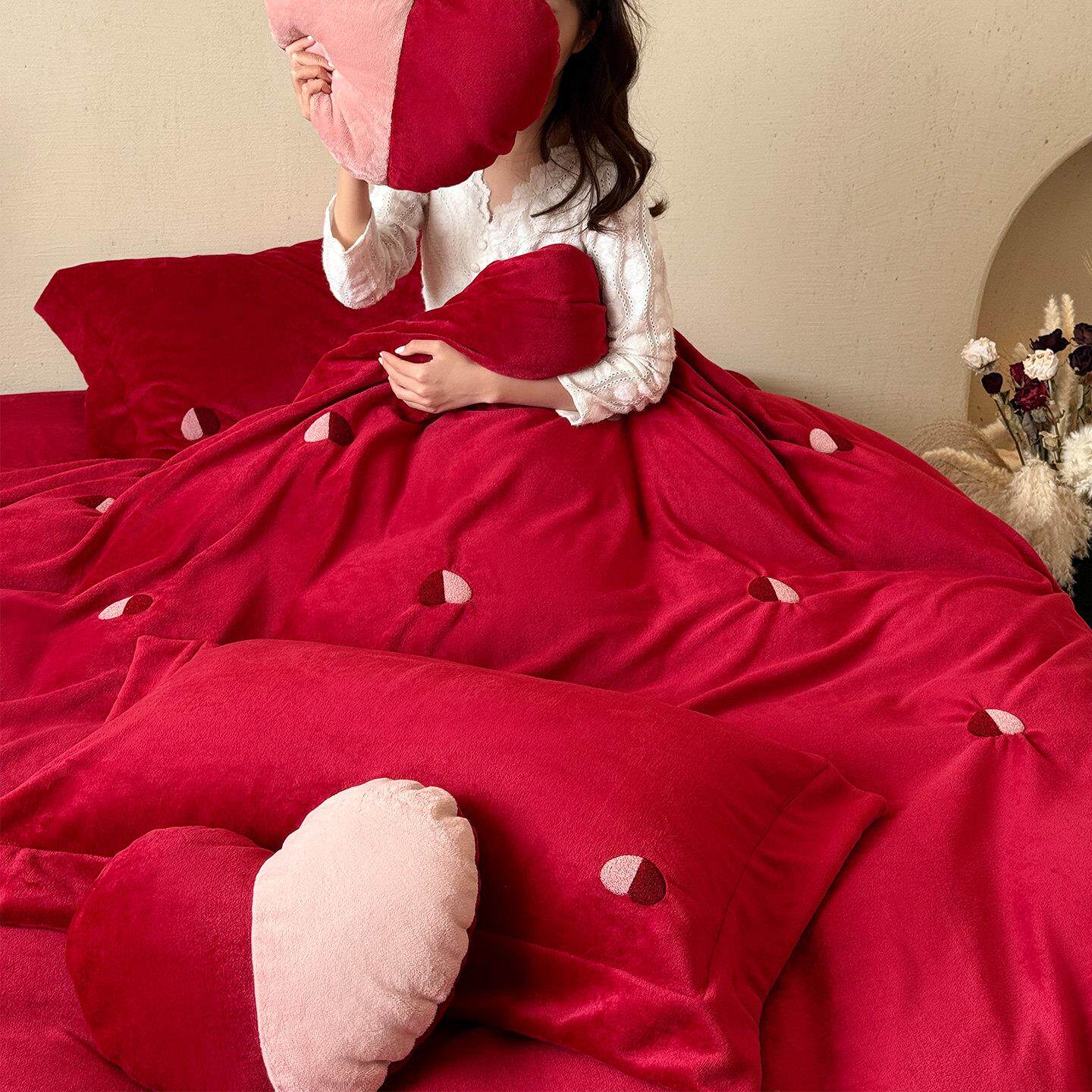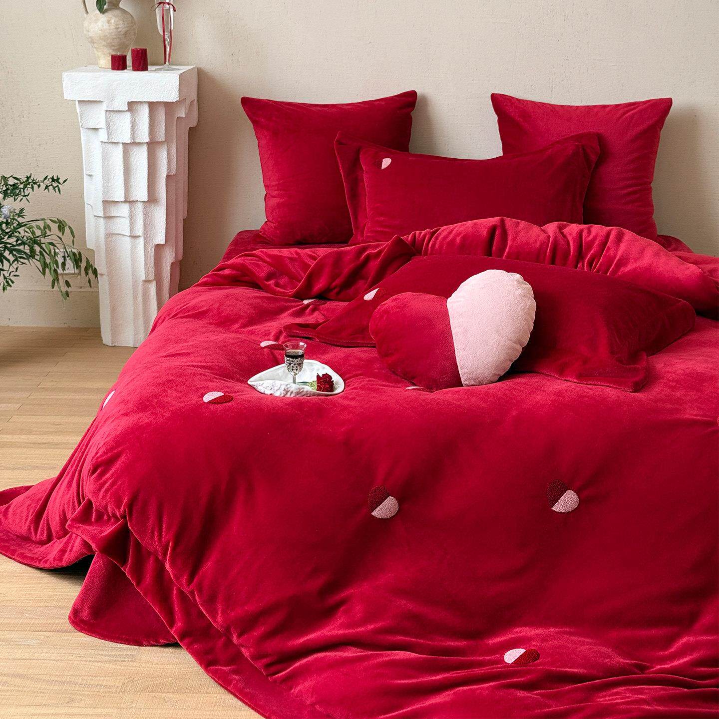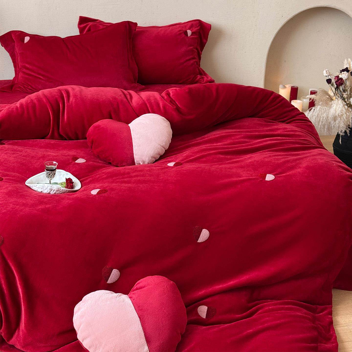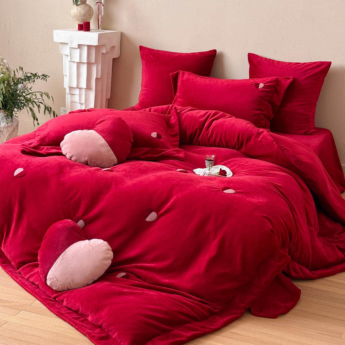 LANSWAY浪漫爱心牛奶绒婚庆四件套冬天保暖红色结婚被套床单床盖