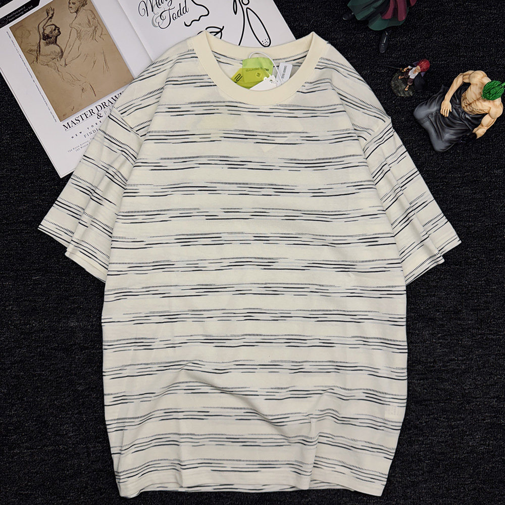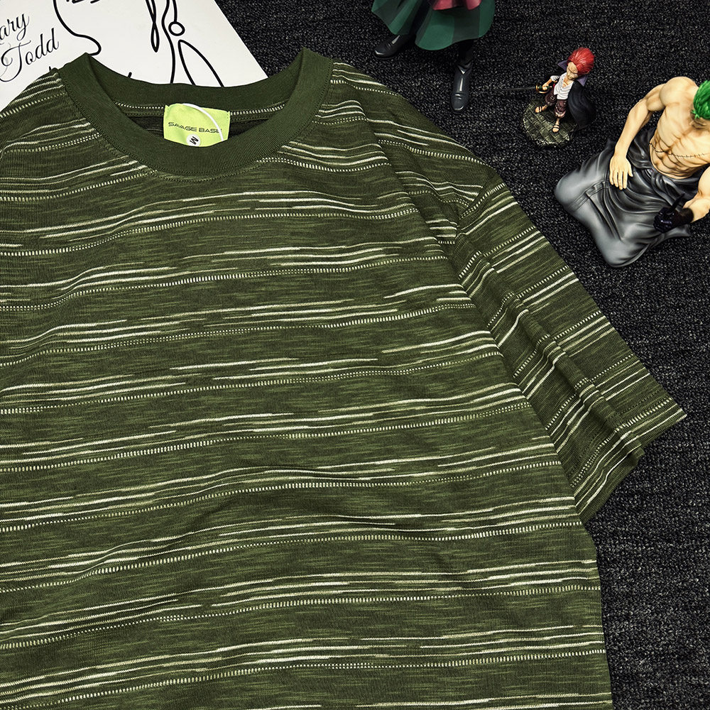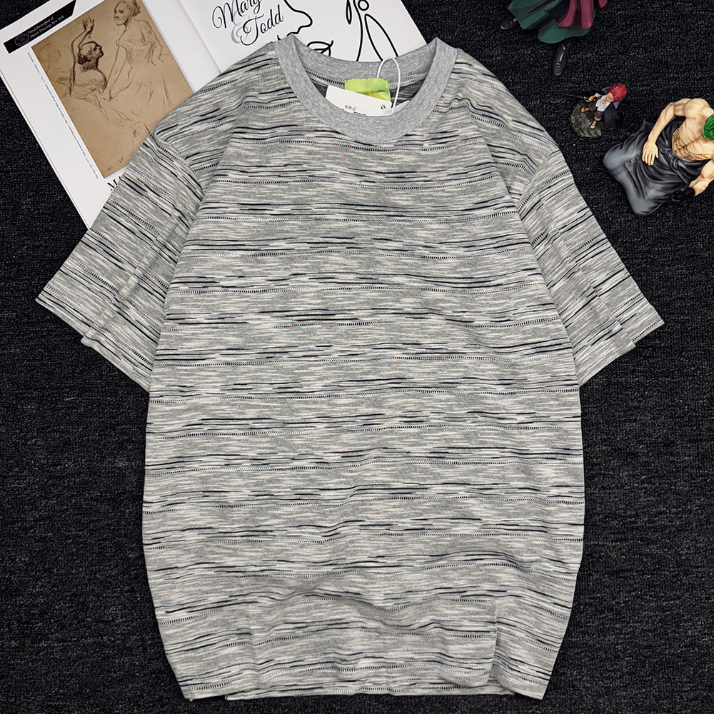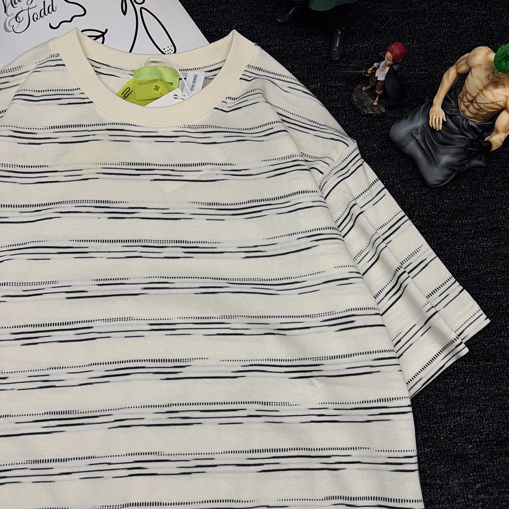美式复古潮牌透气竹节棉条纹圆领短袖t恤男女款夏季宽松情侣上衣