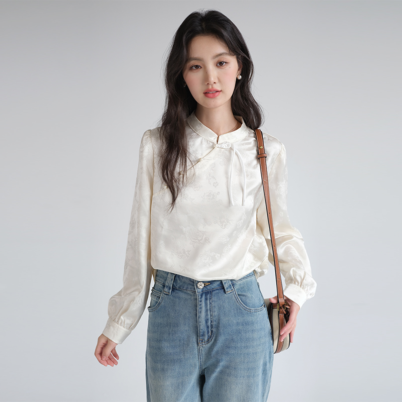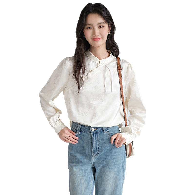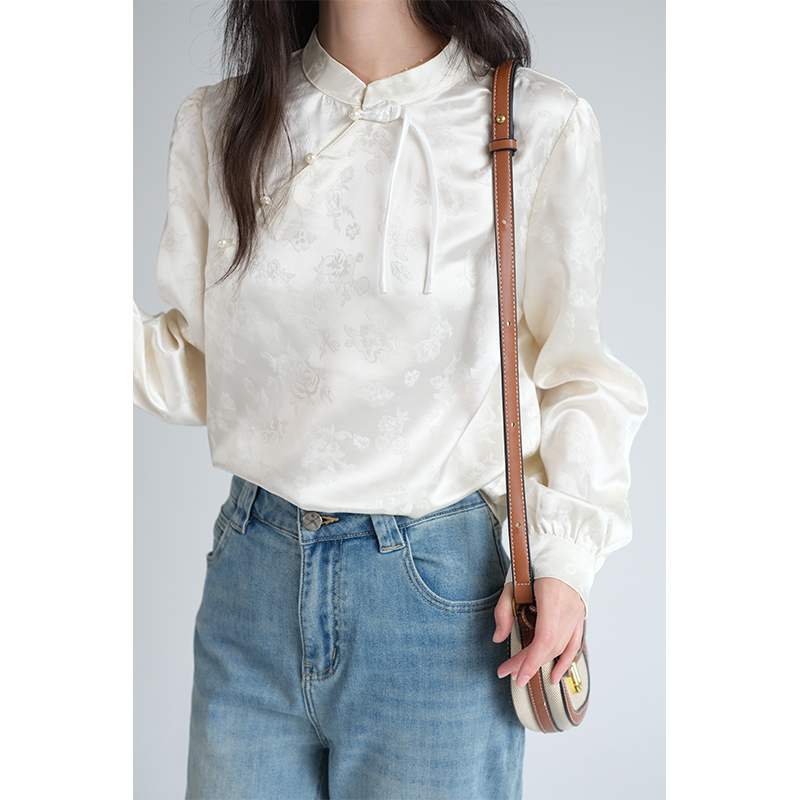 【新中式提花缎面衬衫】蓝若水大码2025秋装新款斜襟珍珠盘扣上衣