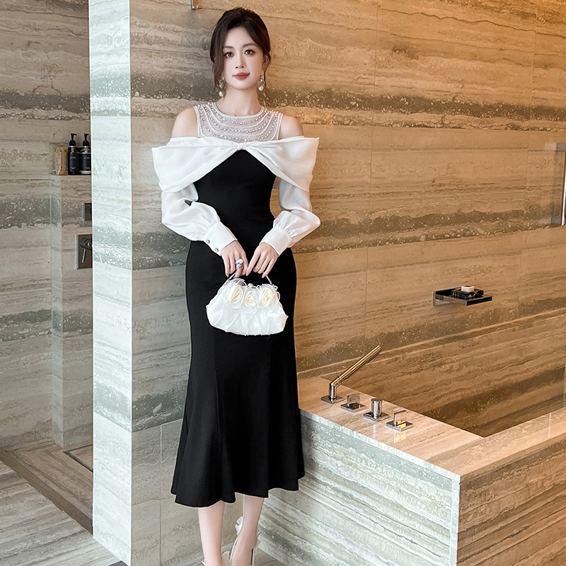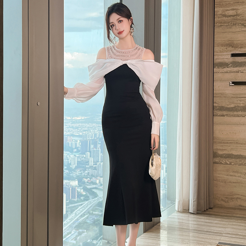 法式高端轻奢高级感连衣裙女秋季新款收腰显瘦气质拼接长袖鱼尾裙