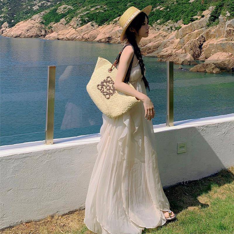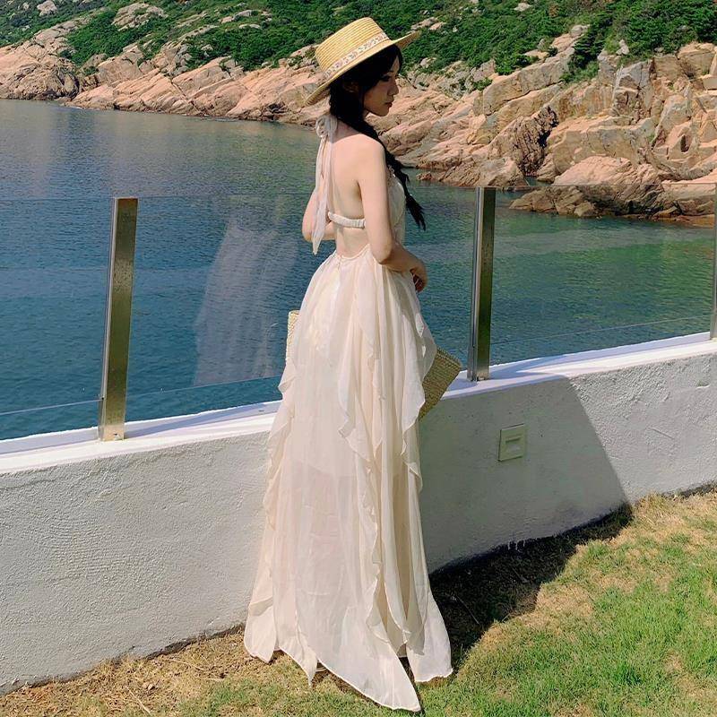 三亚气质重工挂脖吊带连衣裙女夏季长裙拍照露背海边度假沙滩裙子