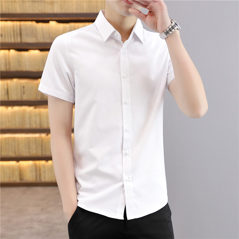 以纯夏季男士白色短袖衬衫薄款排扣职业正装黑色冰丝衬衣西装纯色