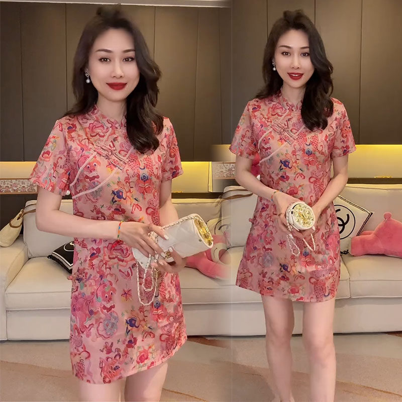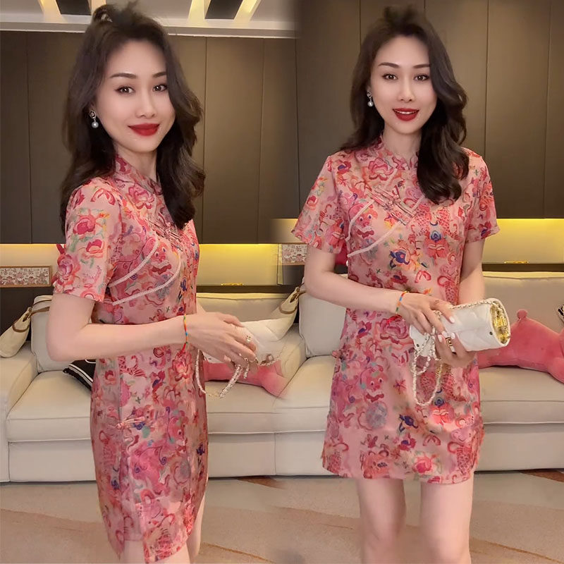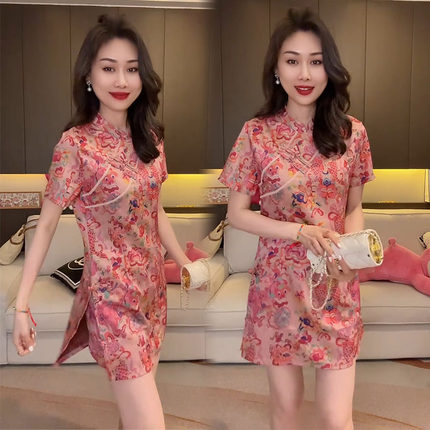 国风时尚套装女2025夏新款气质盘扣开叉旗袍裙短裤显瘦花色两件套