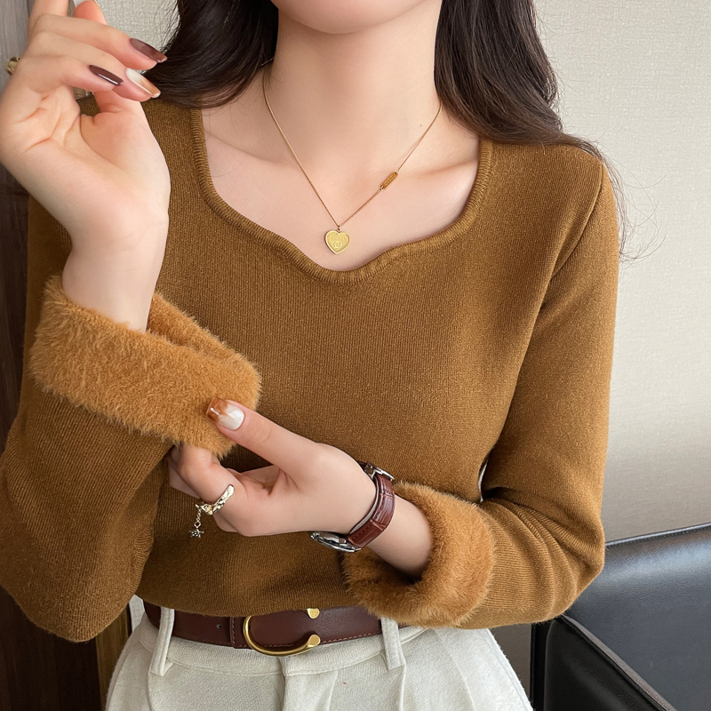 V领加绒打底衫女装内搭2025秋冬季新款加厚白色毛衣针织保暖上衣