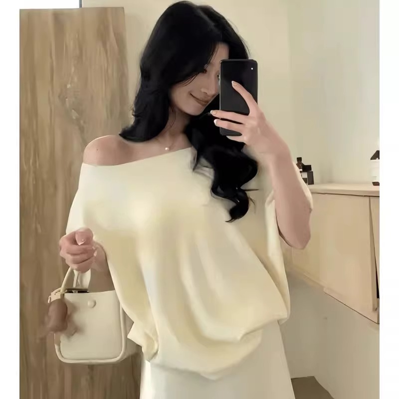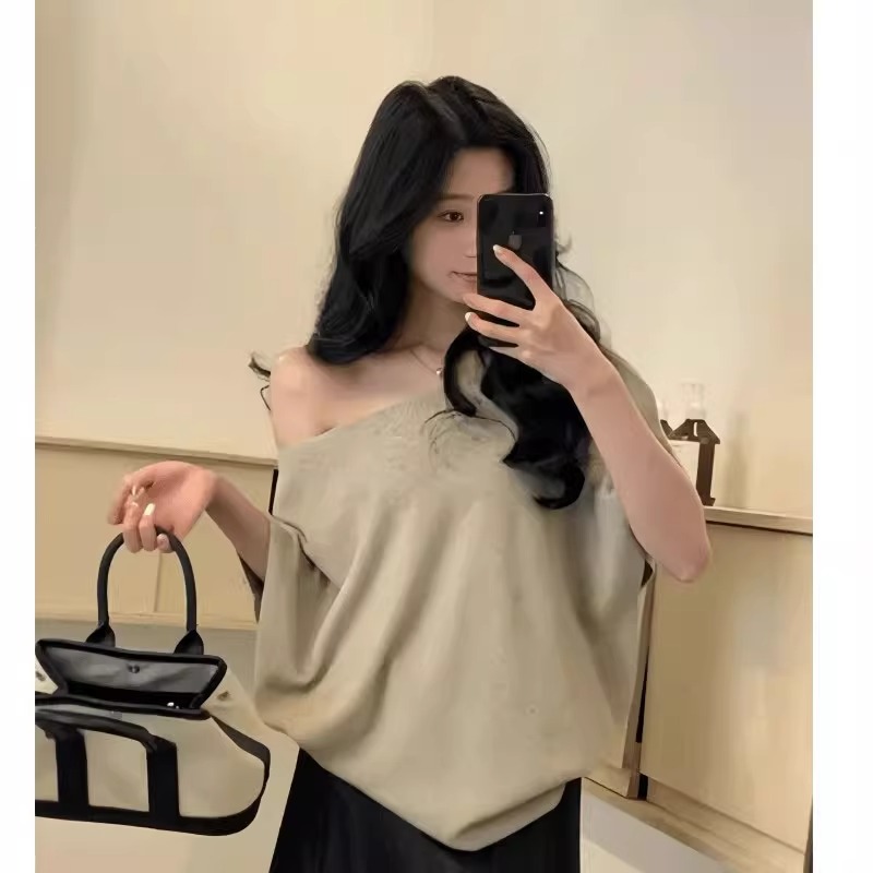 黄色不规则设计感斜肩针织短袖T恤女夏季初夏多巴胺穿搭露肩上衣