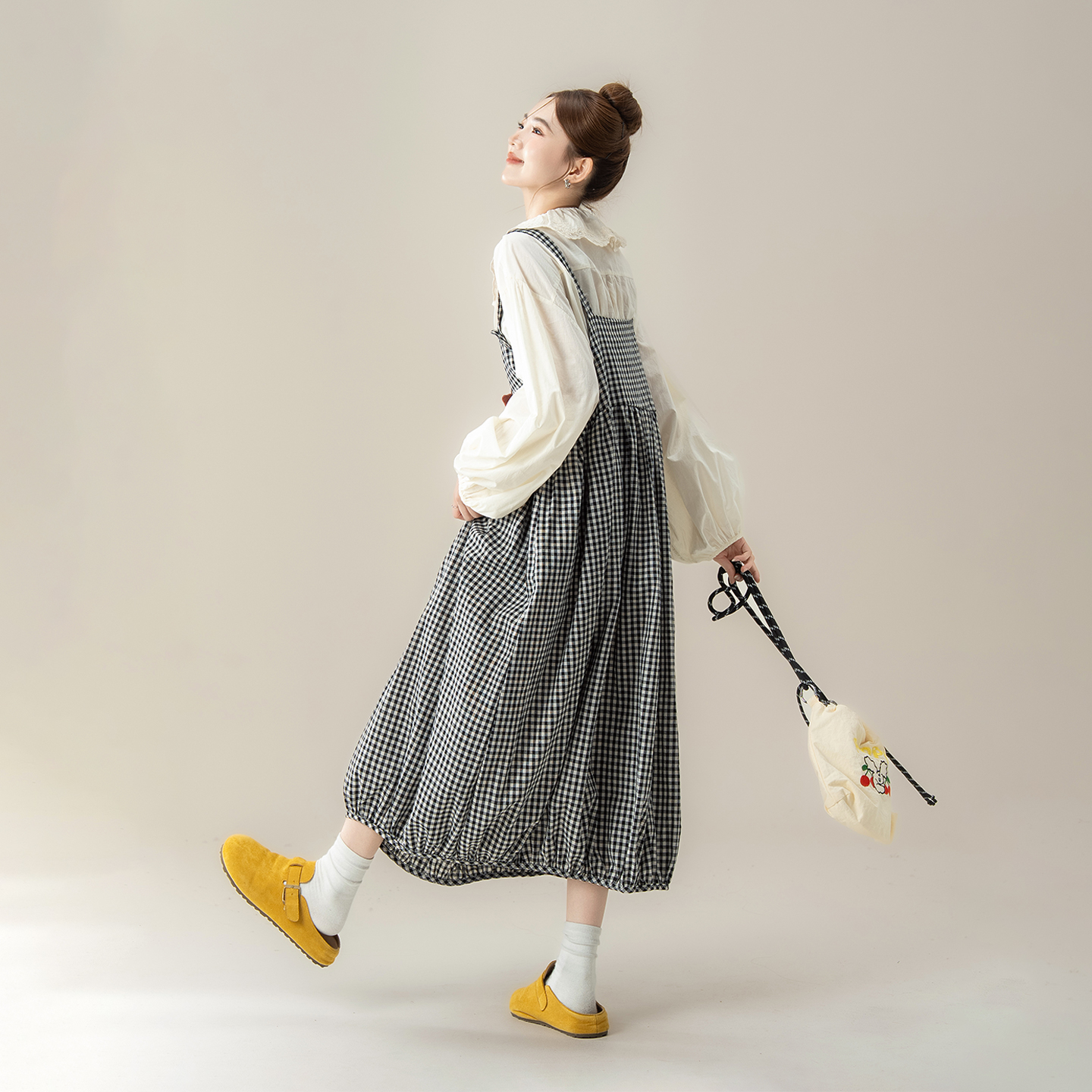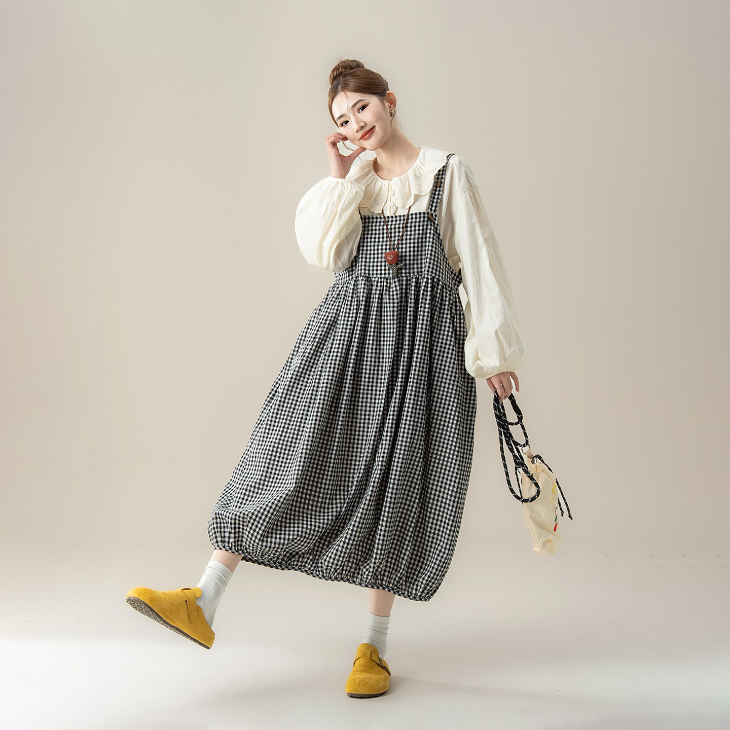 黑色复古格纹花苞背带连衣裙女秋季新款森系甜美减龄宽松吊带长裙