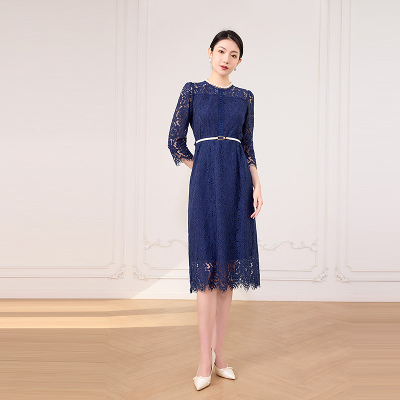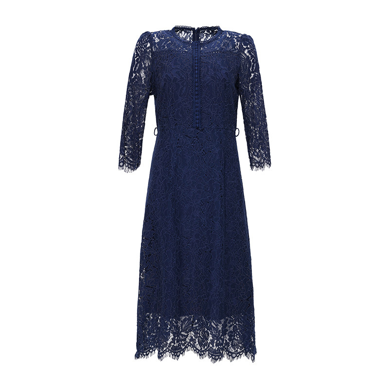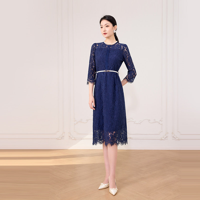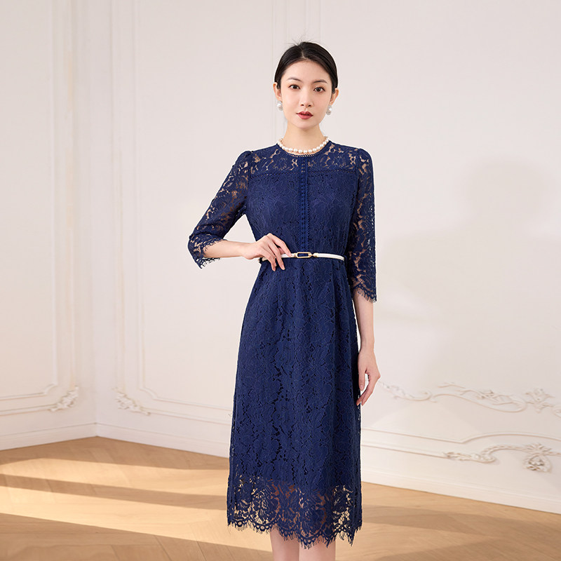 希区瑞普2025春季新款女装蕾丝连衣裙深蓝色七分袖气质中长款