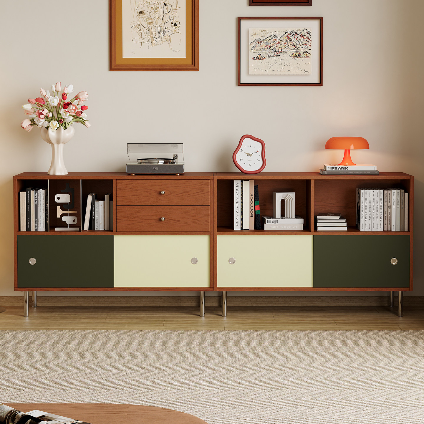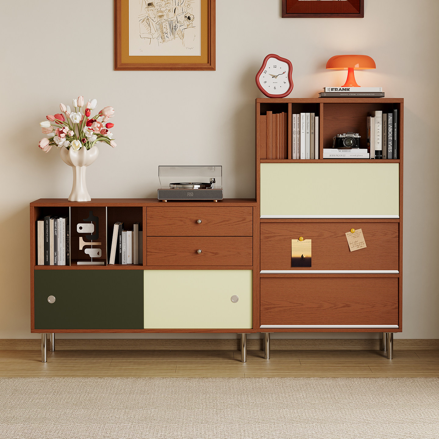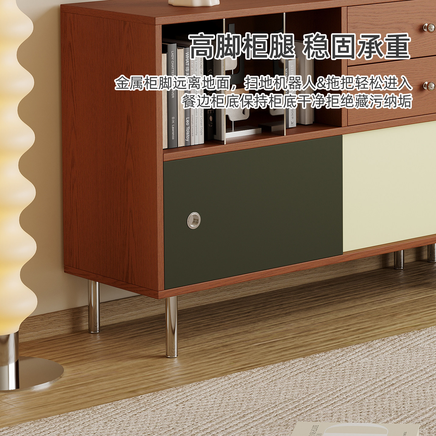 实木餐边柜靠墙一体储物柜中古风客厅拼色置物柜厨房橱柜茶水柜