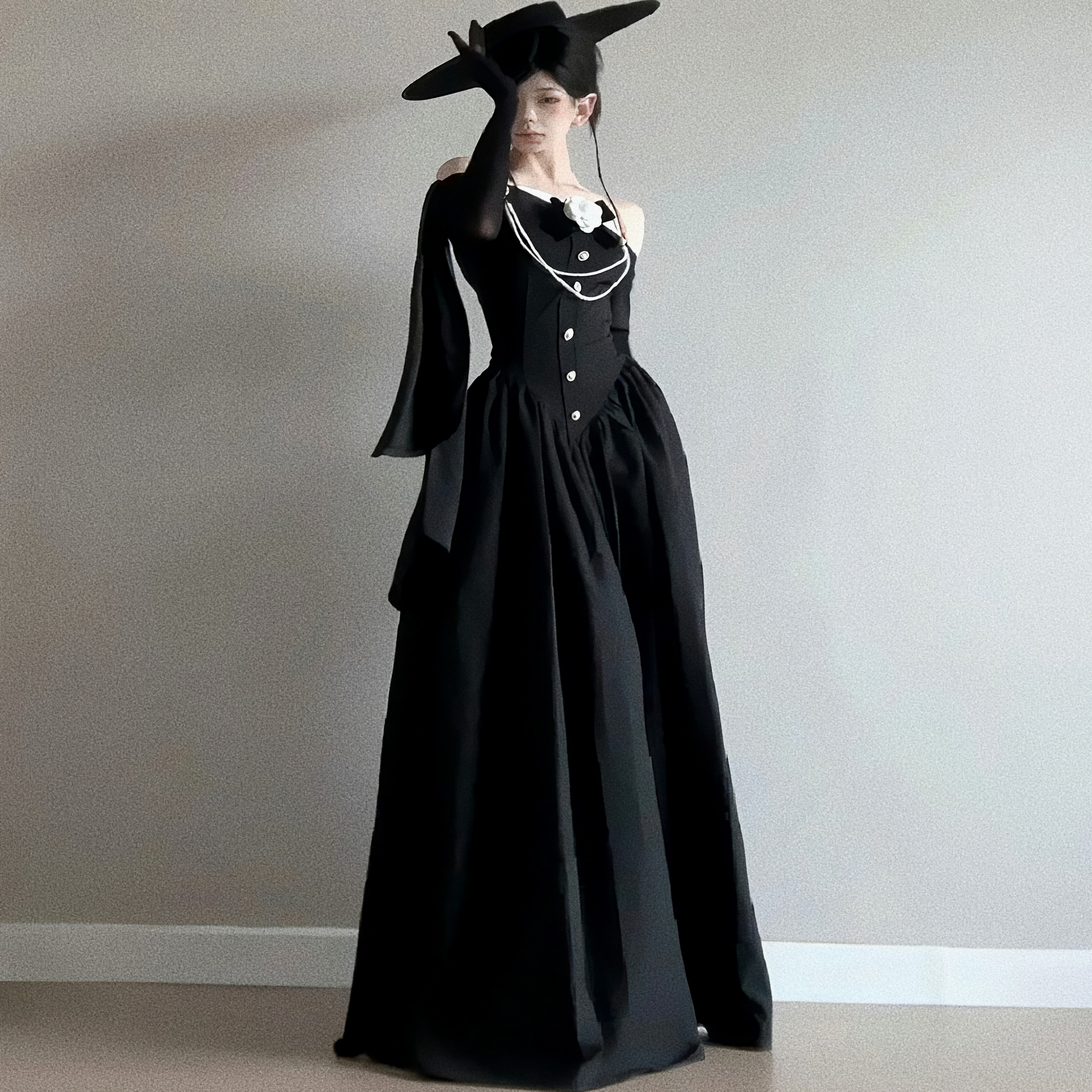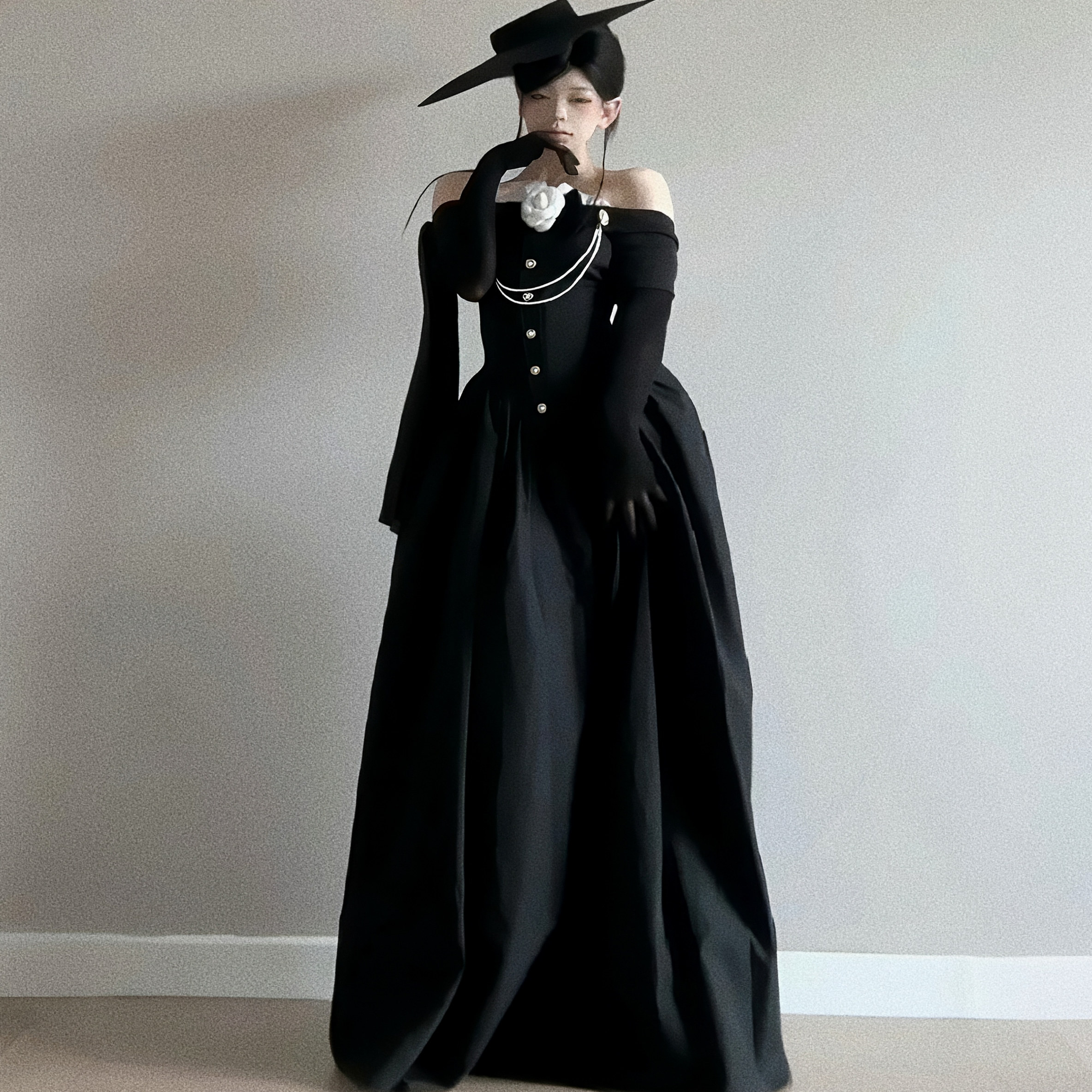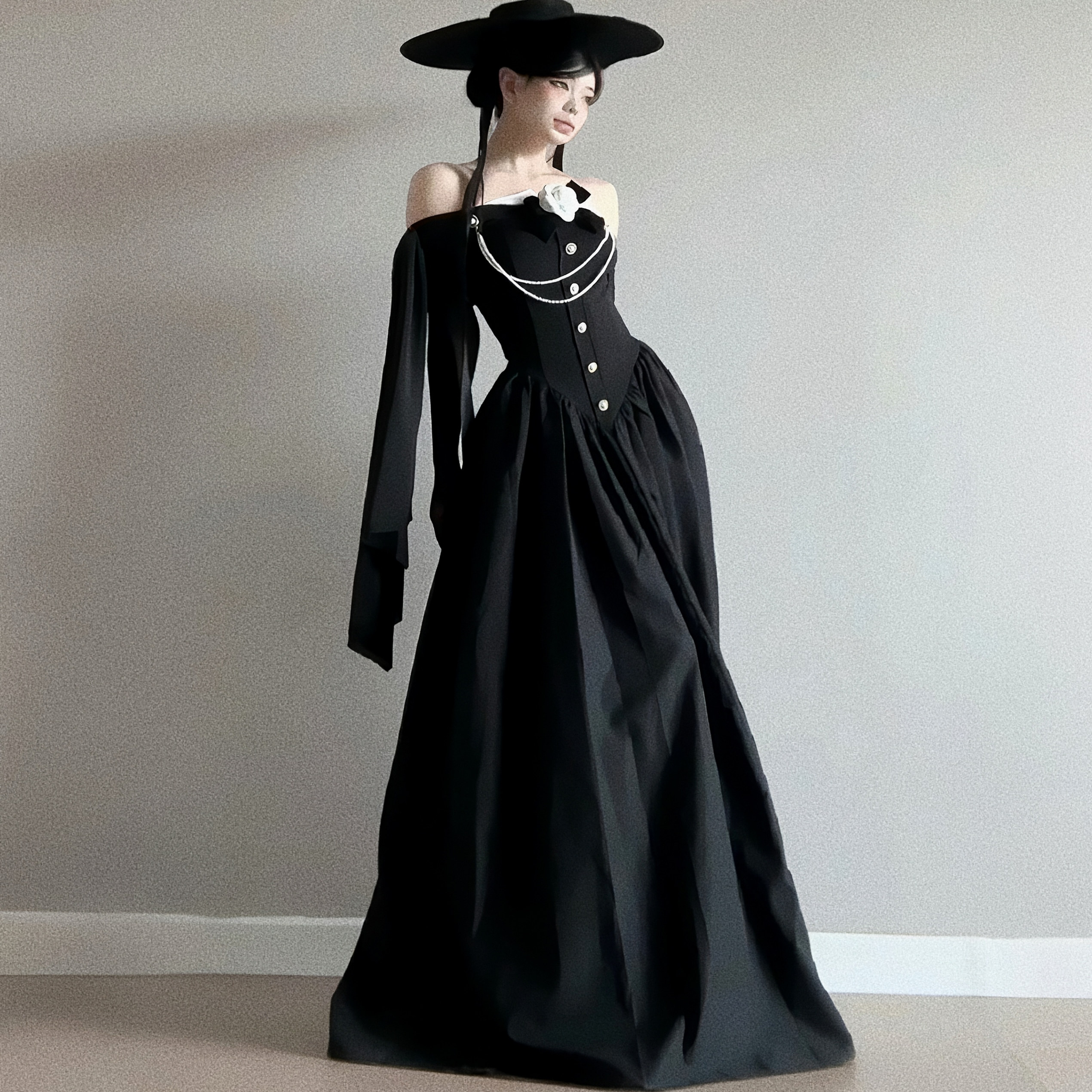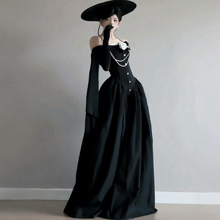 HunterGirl Jennie同款一字肩立体花朵长袖礼服裙收腰大摆连衣裙