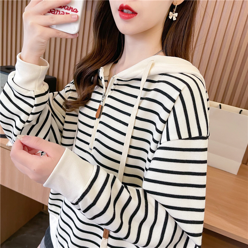 早秋薄款条纹卫衣女春秋季韩版宽松设计感小众小个子连帽上衣外套
